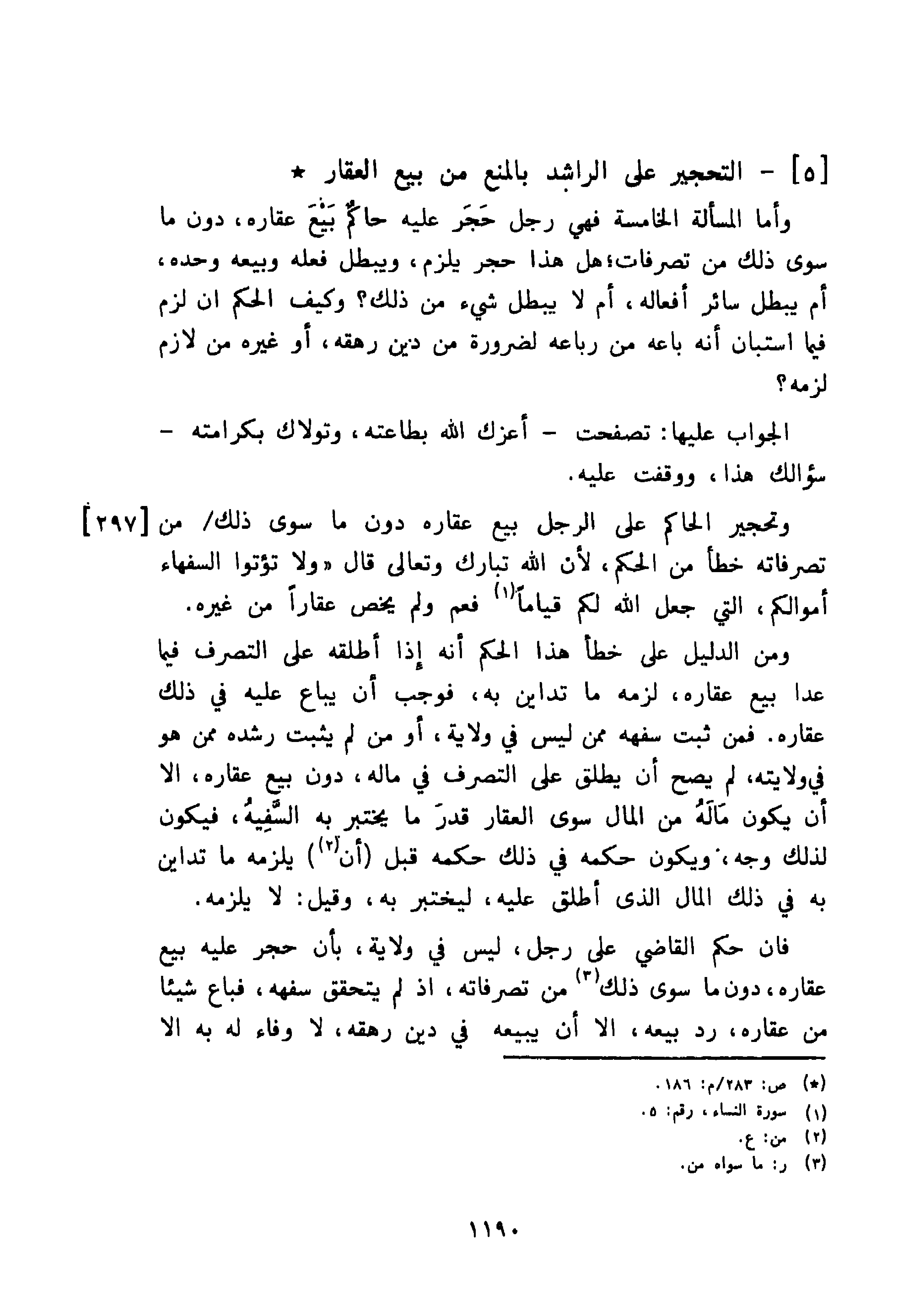 وتحجير الحاكم على الرجل بيع عقاره دون ما سوى ذلك من تصرفاته خطأ من الحكم، لأن الله تبارك وتعالى قال: {وَلَا تُؤْتُوا السُّفَهَاءَ أَمْوَالَكُمُ الَّتِي جَعَلَ اللَّهُ لَكُمْ قِيَامًا} [النساء: 5] فعم ولم يخص عقارًا من غيره.
