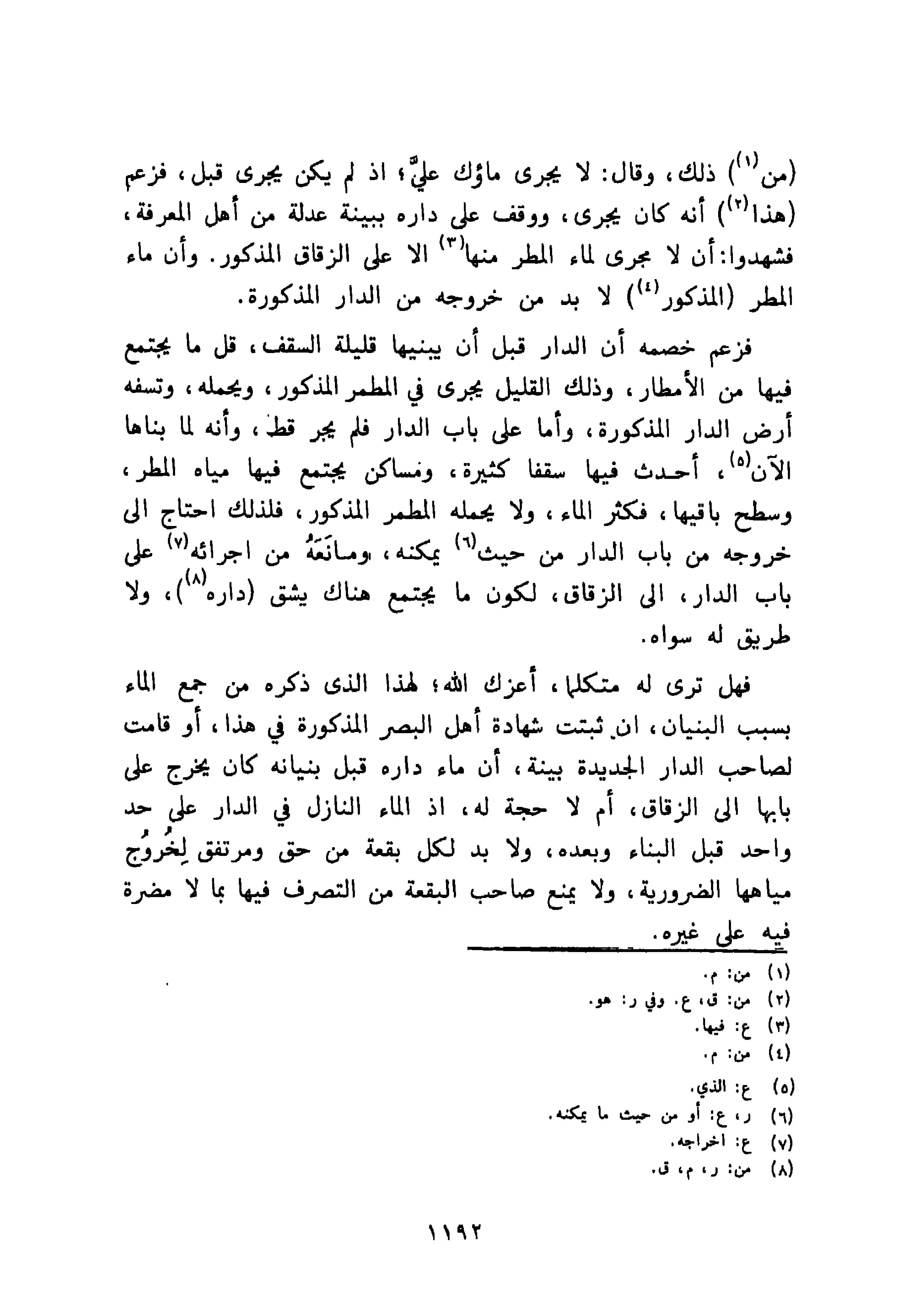 فزعم خصمه أن الدار قبل أن يبنيها قليلة السقف، قل ما يجتمع فيها من الأمطار، وذلك القليل يجري في المطمر المذكور، ويحمله، وتسفه أرض الدار المذكورة، وأما على باب الدار فلم يجر قط، وأنه لما بناها الآن، أحدث فيها سقفا كثيرة، ومساكن يجتمع فيها مياه المطر، وسطح باقيها، فكثر الماء، ولا يحمله المطمر المذكور، فلذلك احتاج إلى خروجه من باب الدار من حيث يمكنه، ومانَعَهُ من إجرائه على باب الدار، إلى الزقاق، لكون ما يجتمع هناك يشق داره، ولا طريق له سواه.