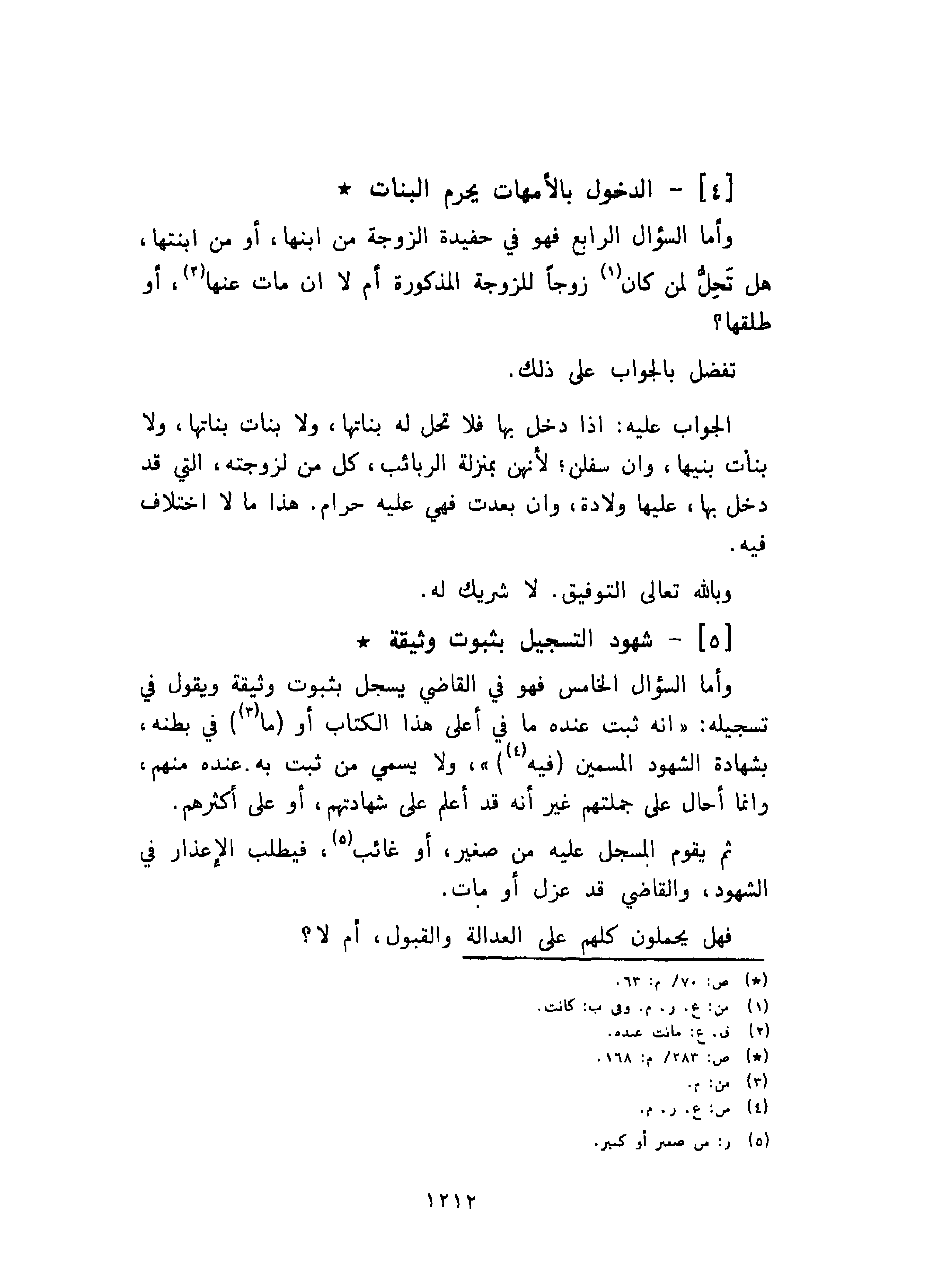 وأما السؤال الخامس فهو في القاضي يسجل بثبوت وثيقة ويقول في تسجيله: " أنه ثبت عنده ما في أعلى هذا الكتاب أو ما في بطنه، بشهادة الشهود المسمين فيه "، ولا يسمى من ثبت به عنده منهم، وإنما أحال على جملتهم غير أنه قد أعلم على شهادتهم، أو على أكثرهم.