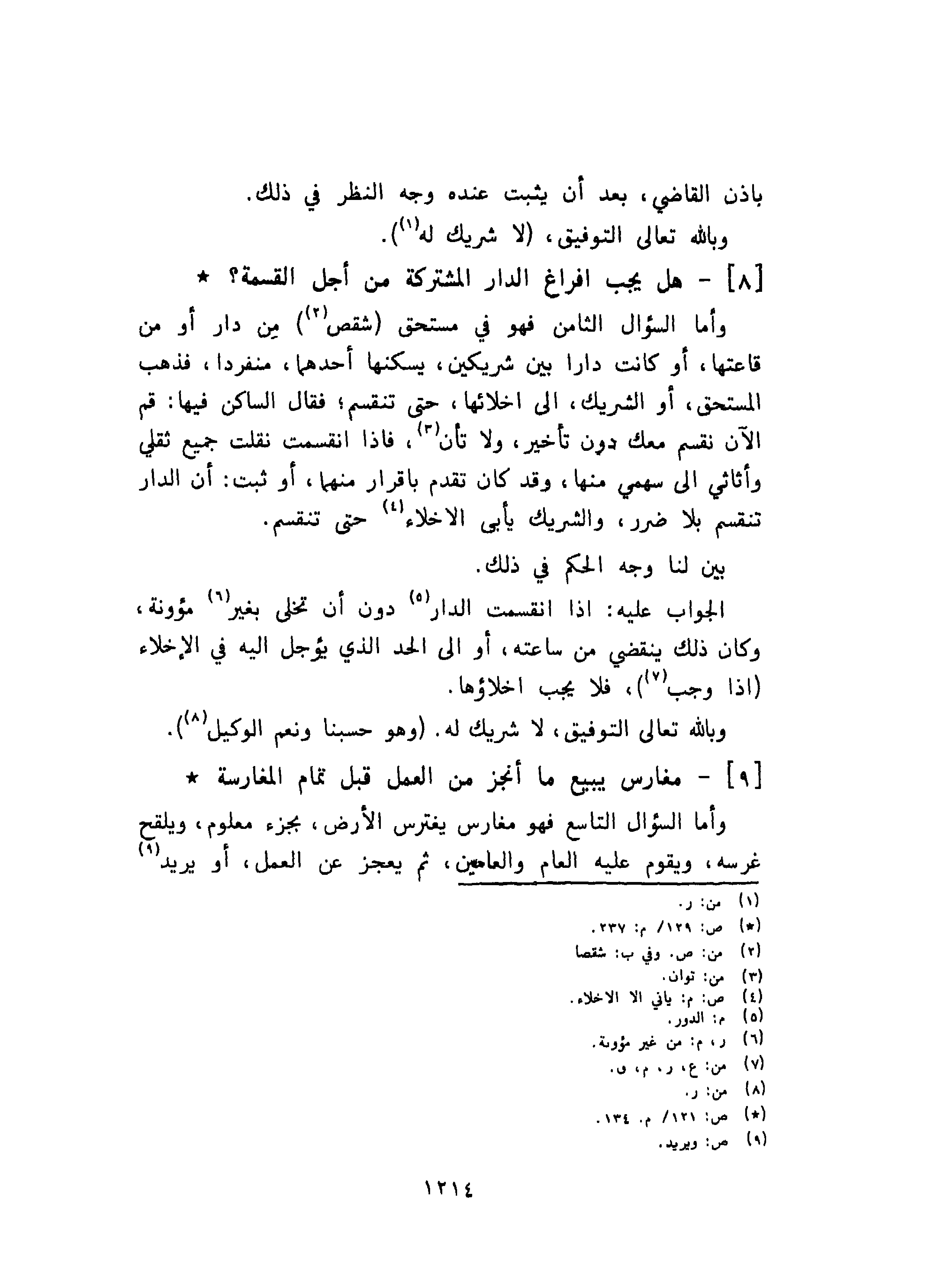 وأما السؤال الثامن فهو في مستحق شقص مِن دار أو من قاعتها، أو كانت دارا بين شريكين، يسكنها أحدهما، منفردا، فذهب المستحق، أو الشريك، إلى إخلائها، حتى تنقسم؛ فقال الساكن فيها: قم الآن نقسم معك دون تأخير، ولا تأن، فإذا انقسمت نقلت جميع ثقلي وأثاثي إلى سهمي منها، وقد كان تقدم بإقرار منهما، أو ثبت: أن الدار تنقسم بلا ضرر، والشريك يأبى الأخلاء حتى تنقسم.