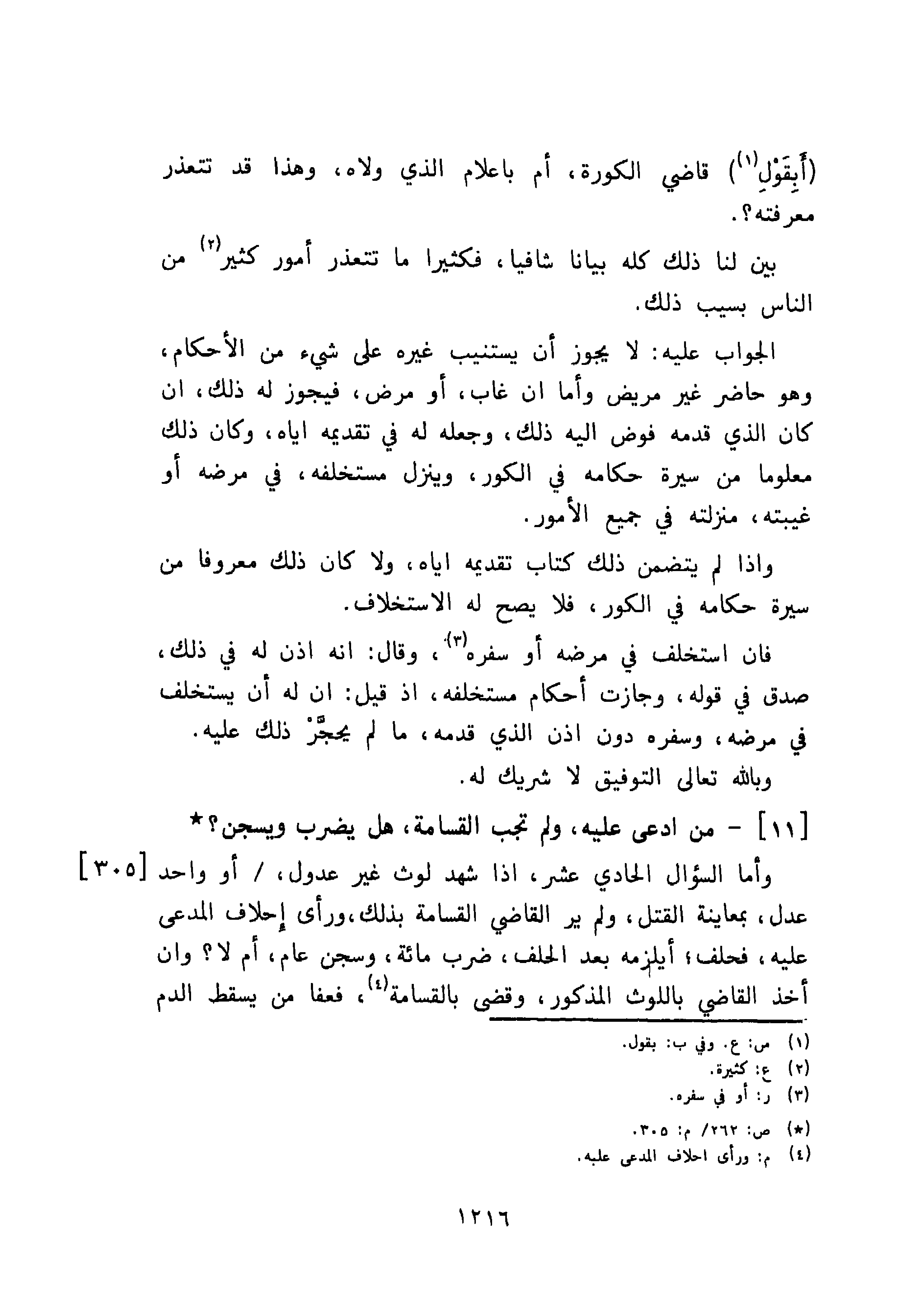 وأما السؤال الحادي عشر، إذا شهد لوث غير عدول، أو واحد عدل، بمعاينة القتل، ولم ير القاضي القسامة بذلك، ورأى إحلاف المدعى عليه، فحلف؛ أيلزمه بعد الحلف، ضرب مائة، وسجن عام، أم لا؟ وإن أخذ القاضي باللوث المذكور، وقضى بالقسامة، فعفا من يسقط الدم