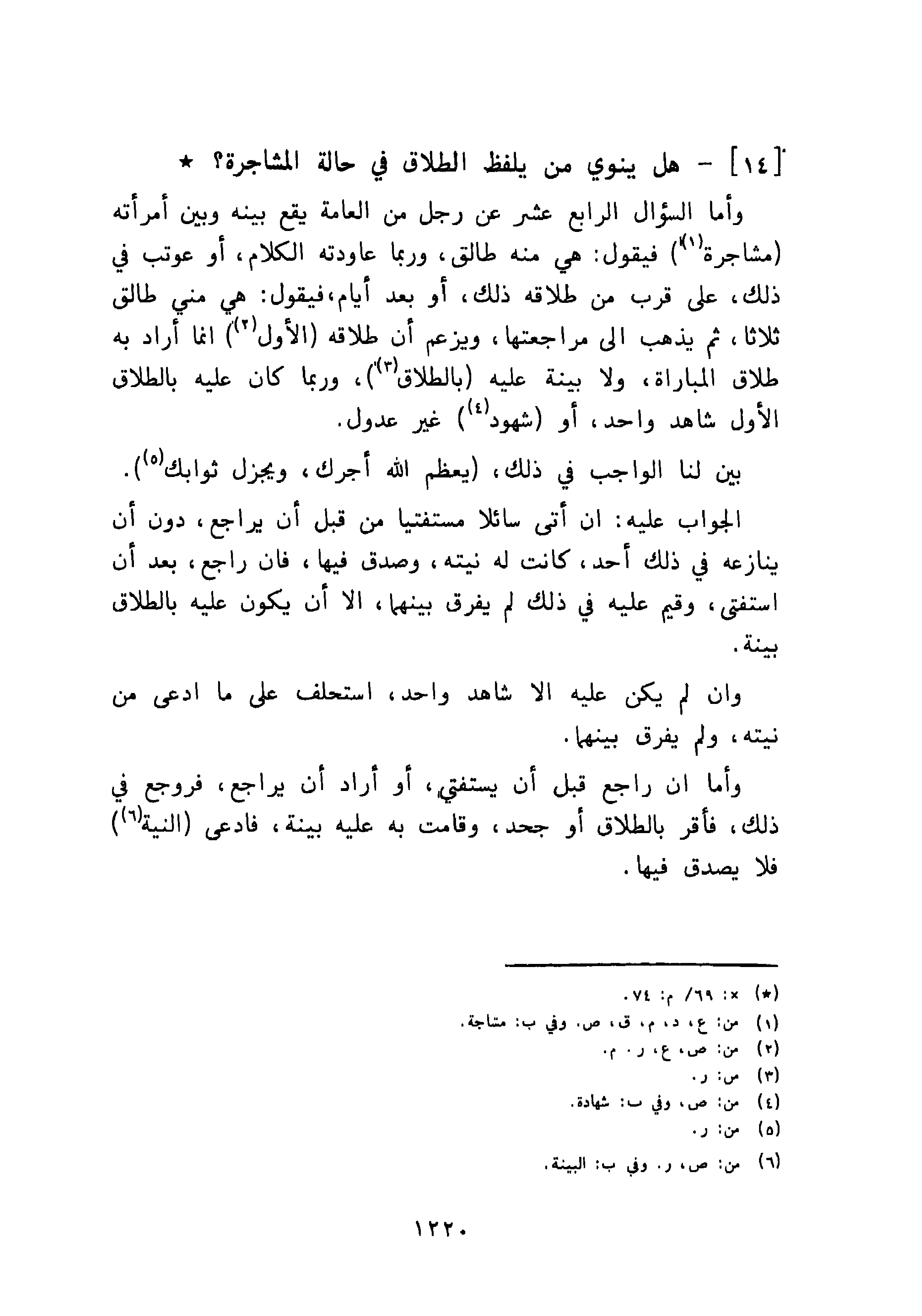 وأما السؤال الرابع عشر عن رجل من العامة يقع بينه وبين امرأته مشاجرة فيقول: هي منه طالق، وربما عاودته الكلام، أو عوتب في ذلك، على قرب من طلاقه ذلك، أو بعد أيام، فيقول: هي مني طالق ثلاثا، ثم يذهب إلى مراجعتها، ويزعم أن طلاقه الأول إنما أراد به طلاق المباراة، ولا بينة عليه بالطلاق، وربما كان عليه بالطلاق الأول شاهد واحد، أو شهود غير عدول.