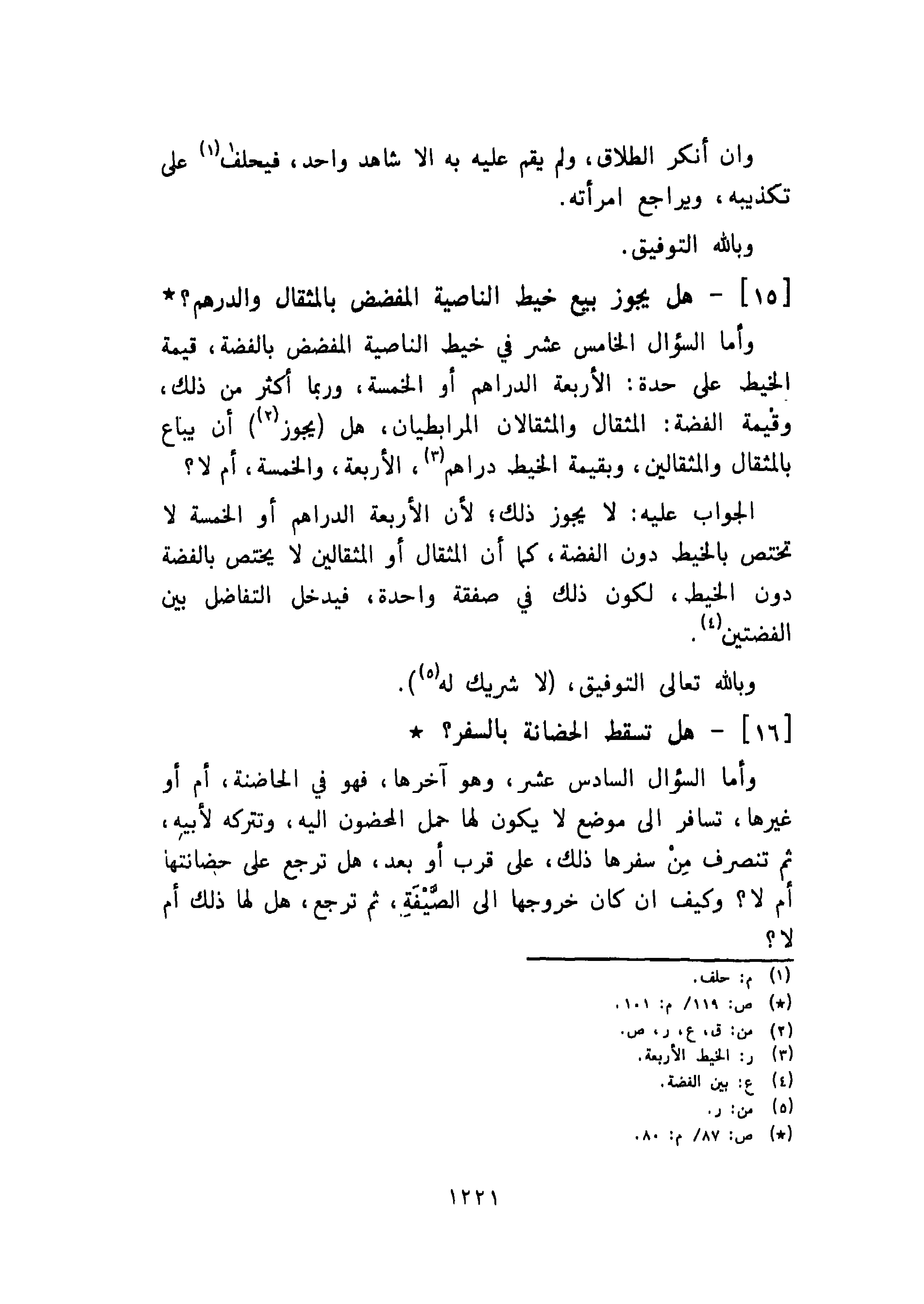 وأما السؤال الخامس عشر في خيط الناصية المفضض بالفضة، قيمة الخيط على حدة: الأربعة الدراهم أو الخمسة، وربما أكثر من ذلك، وقيمة الفضة: المثقال والمثقالان المرابطيان، هل يجوز أن يباع بالمثقال والمثقالين، وبقيمة الخيط دراهم، الأربعة، والخمسة، أم لا؟