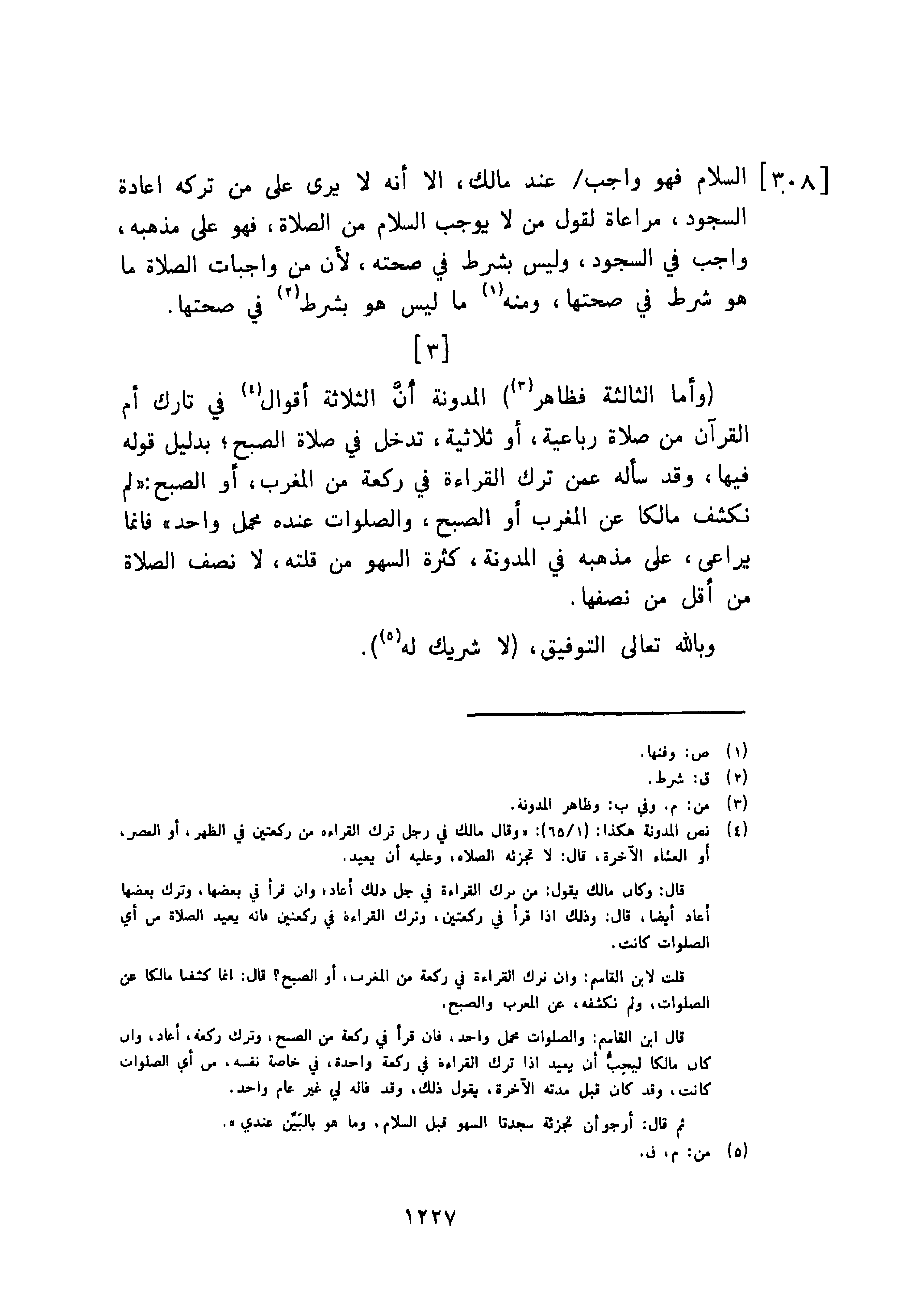 وأما الثالثة فظاهر المدونة أنَّ الثلاثة أقوال في تارك أم القرآن من صلاة رباعية، أو ثلاثية، تدخل في صلاة الصبح؛ بدليل قوله فيها، وقد سأله عمن ترك القراءة في ركعة من المغرب، أو الصبح: " لم نكشف مالكا عن المغرب أو الصبح، والصلوات عنده محمل واحد " فإنما يراعى، على مذهبه في المدونة، كثرة السهو من قلته، لا نصف الصلاة من أقل من نصفها.