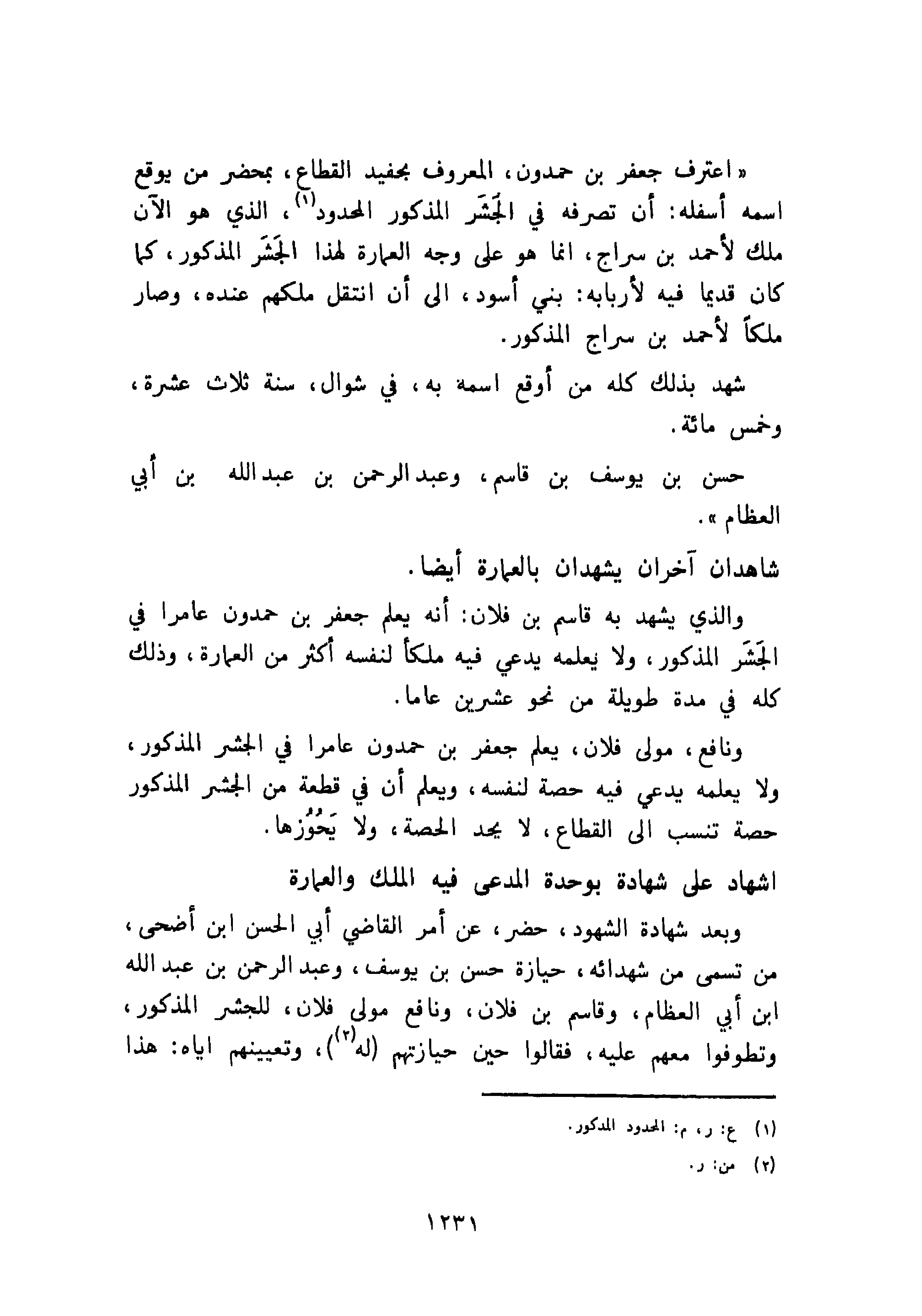 والذي يشهد به قاسم بن فلان: أنه يعلم جعفر بن حمدون عامرا في الجَشَر المذكور، ولا يعلمه يدعي فيه ملكأ لنفسه أكثر من العمارة، وذلك كله في مدة طويلة من نحو عشرين عاما.