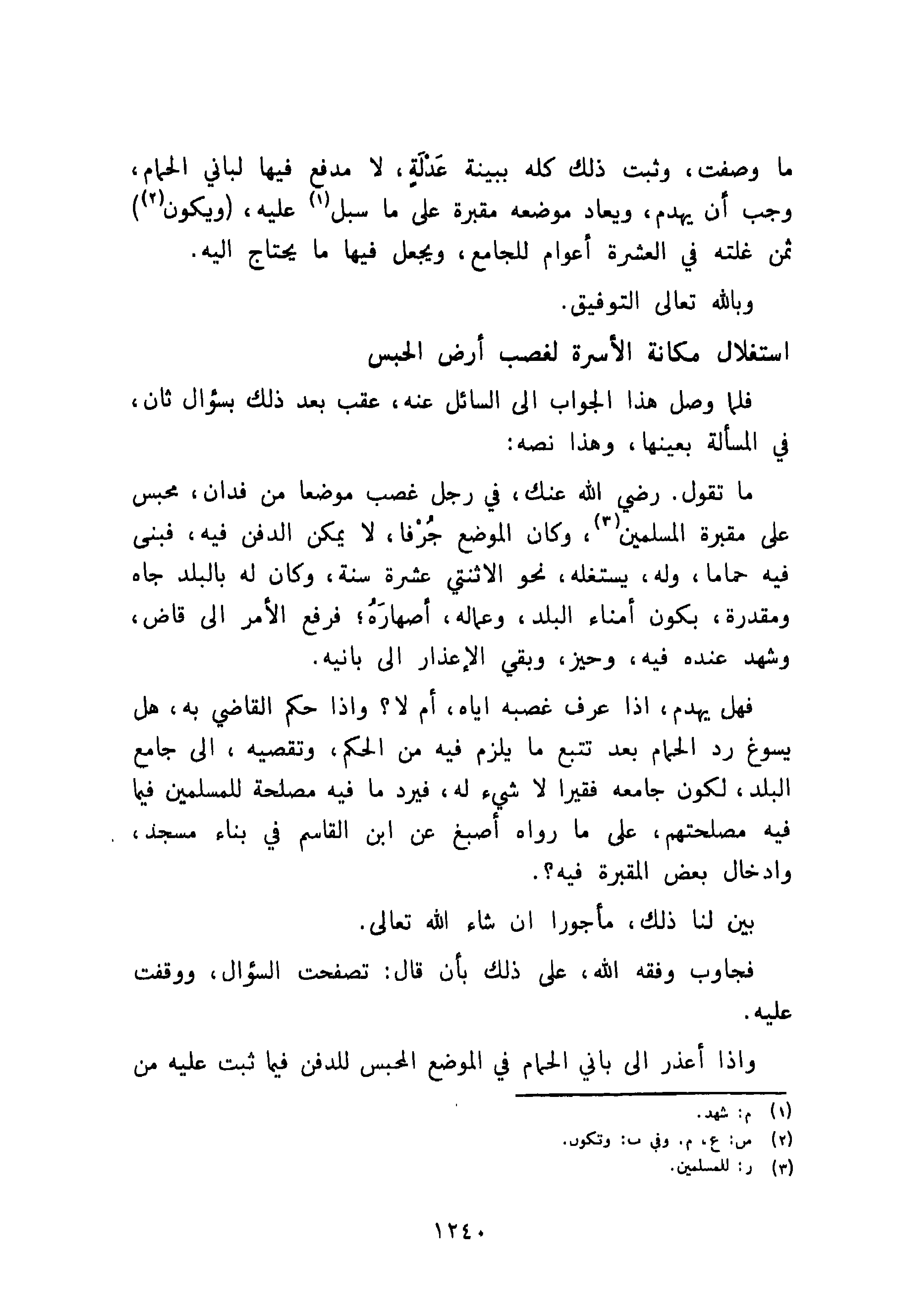 ما تقول رضي الله عنك، في رجل غصب موضعا من فدان، محبس على مقبرة المسلمين، وكان الموضع جُرْفا، لا يمكن الدفن فيه، فبنى فيه حماما، وله، يستغله، نحو الاثنتي عشرة سنة، وكان له بالبلد جاه ومقدرة، بكون أمناء البلد، وعماله، أصهارَهُ؛ فرفع الأمر إلى قاض، وشهد عنده فيه، وحيز، وبقي الإعذار إلى بانيه.