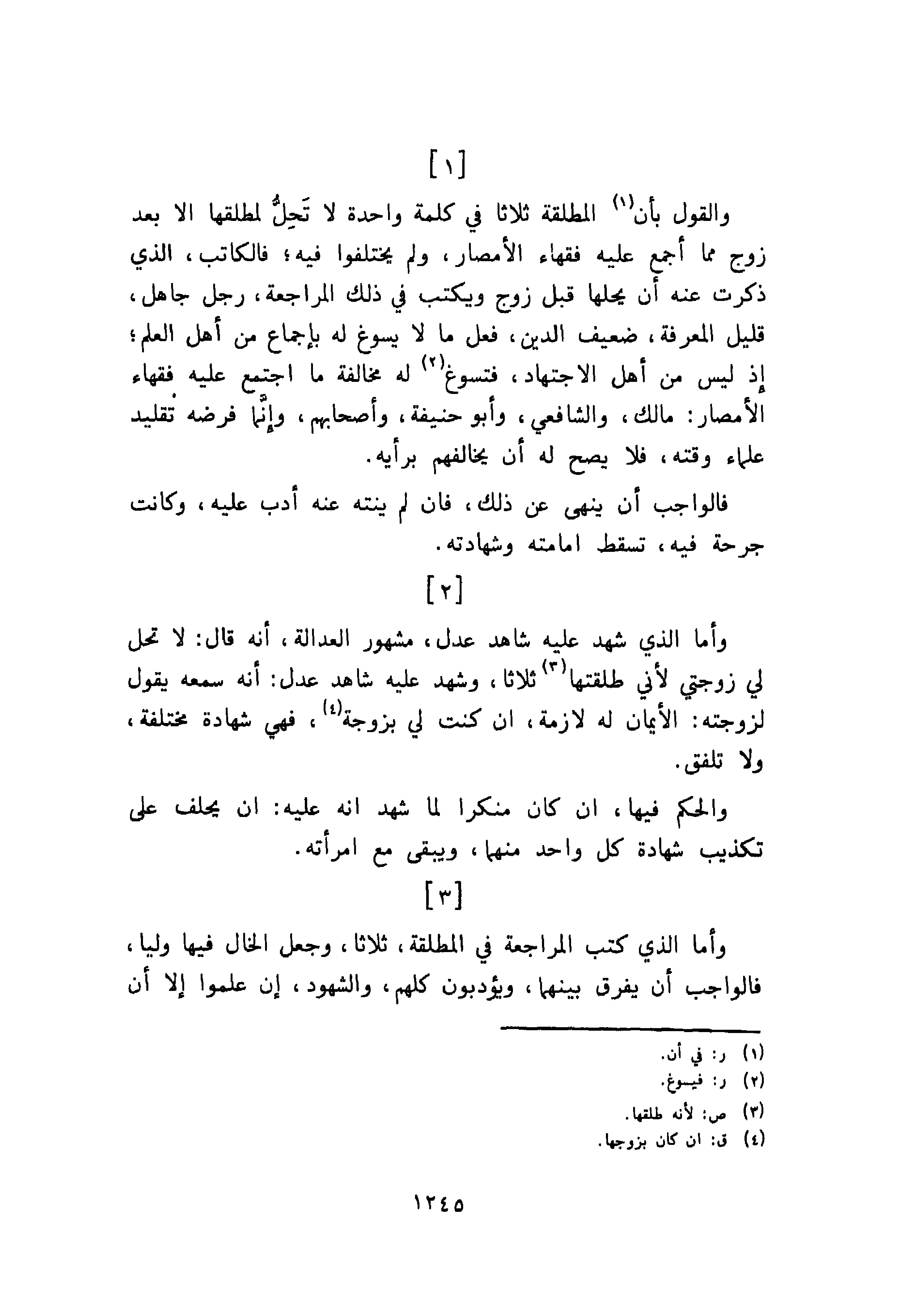 والقول بأن المطلقة ثلاثا في كلمة واحدة لا تَحِلُّ لمطلقها إلا بعد زوج مما أجمع عليه فقهاء الأمصار، ولم يختلفوا فيه؛ فالكاتب، الذي ذكرت عنه أن يحلها قبل زوج ويكتب في ذلك المراجعة، رجل جاهل، قليل المعرفة، ضعيف الدين، فعل ما لا يسوغ له بإجماع من أهل العلم؛ إذ ليس من أهل الاجتهاد، فتسوغ له مخالفة ما اجتمع عليه فقهاء الأمصار: مالك، والشافعي، وأبو حنيفة، وأصحابهم، وإنَّما فرضه تقليد علماء وقته، فلا يصح له أن يخالفهم برأيه.