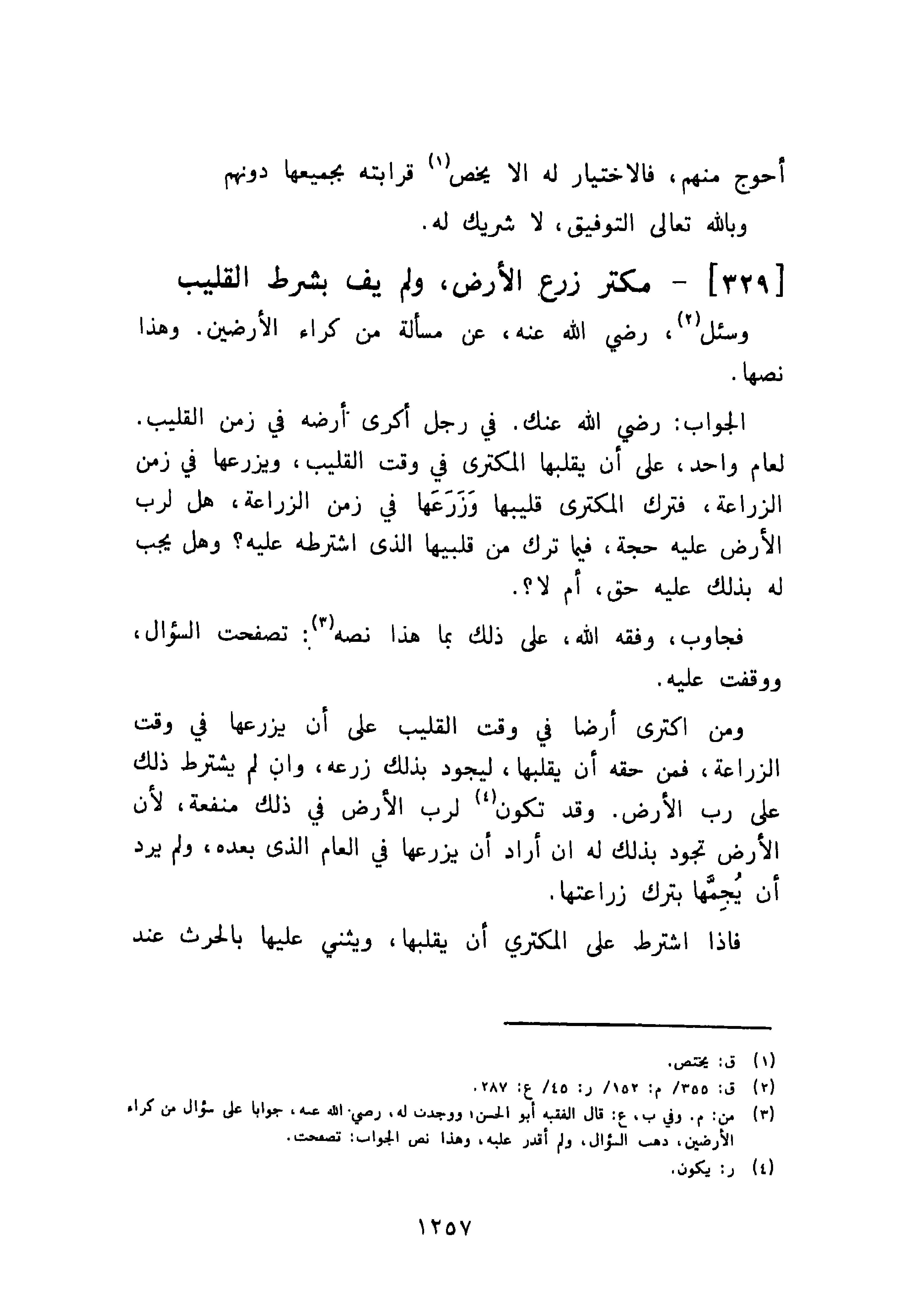 [329]- مكتر زرع الأرض، ولم يف بشرط القليب