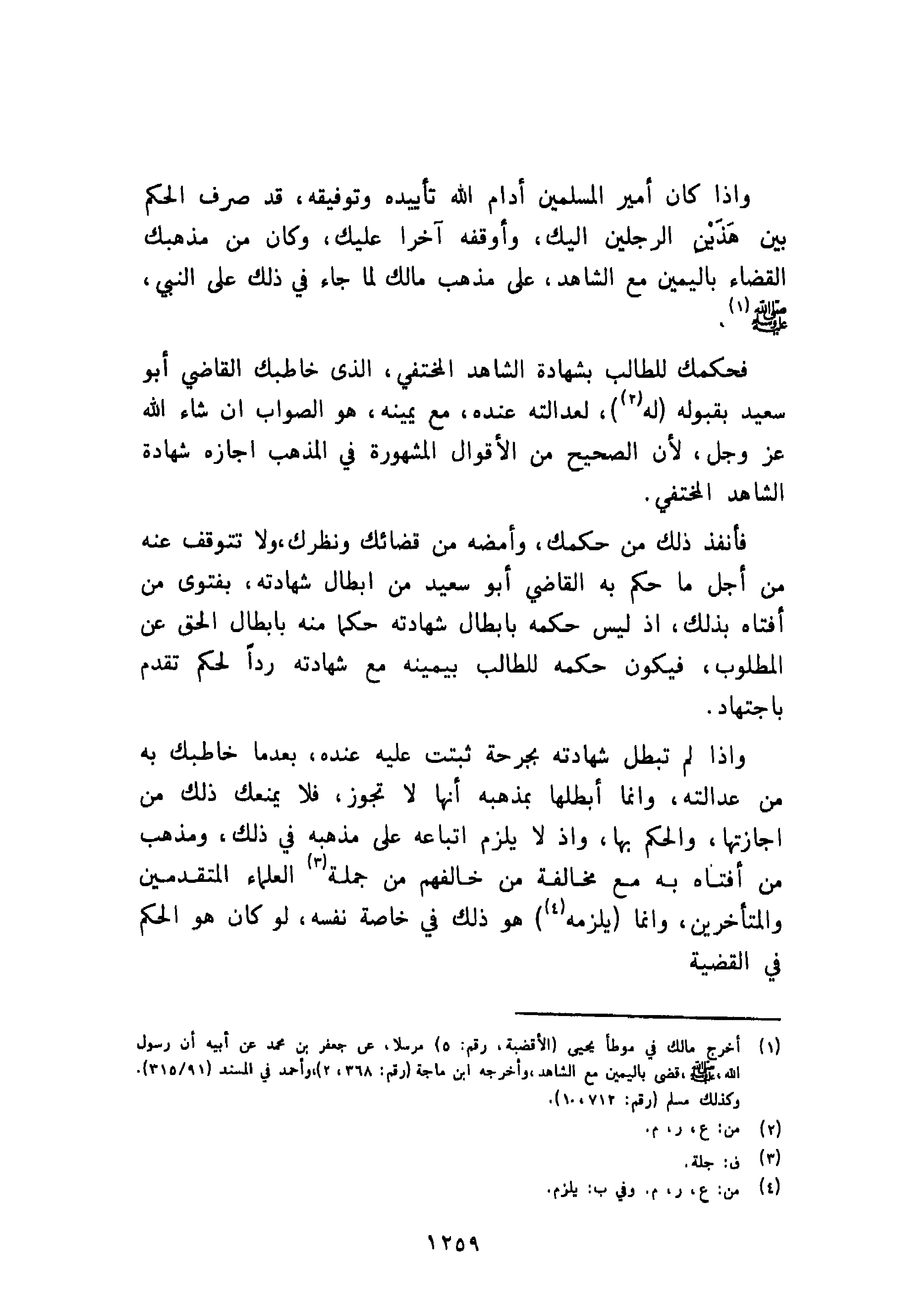 وإذا كان أمير المسلمين أدام الله تأييده وتوفيقه، قد صرف الحكم بين هَذَيْن الرجلين إليك، وأوقفه آخرا عليك، وكان من مذهبك القضاء باليمين مع الشاهد، على مذهب مالك لما جاء في ذلك على النبي صلى الله عليه وسلم.