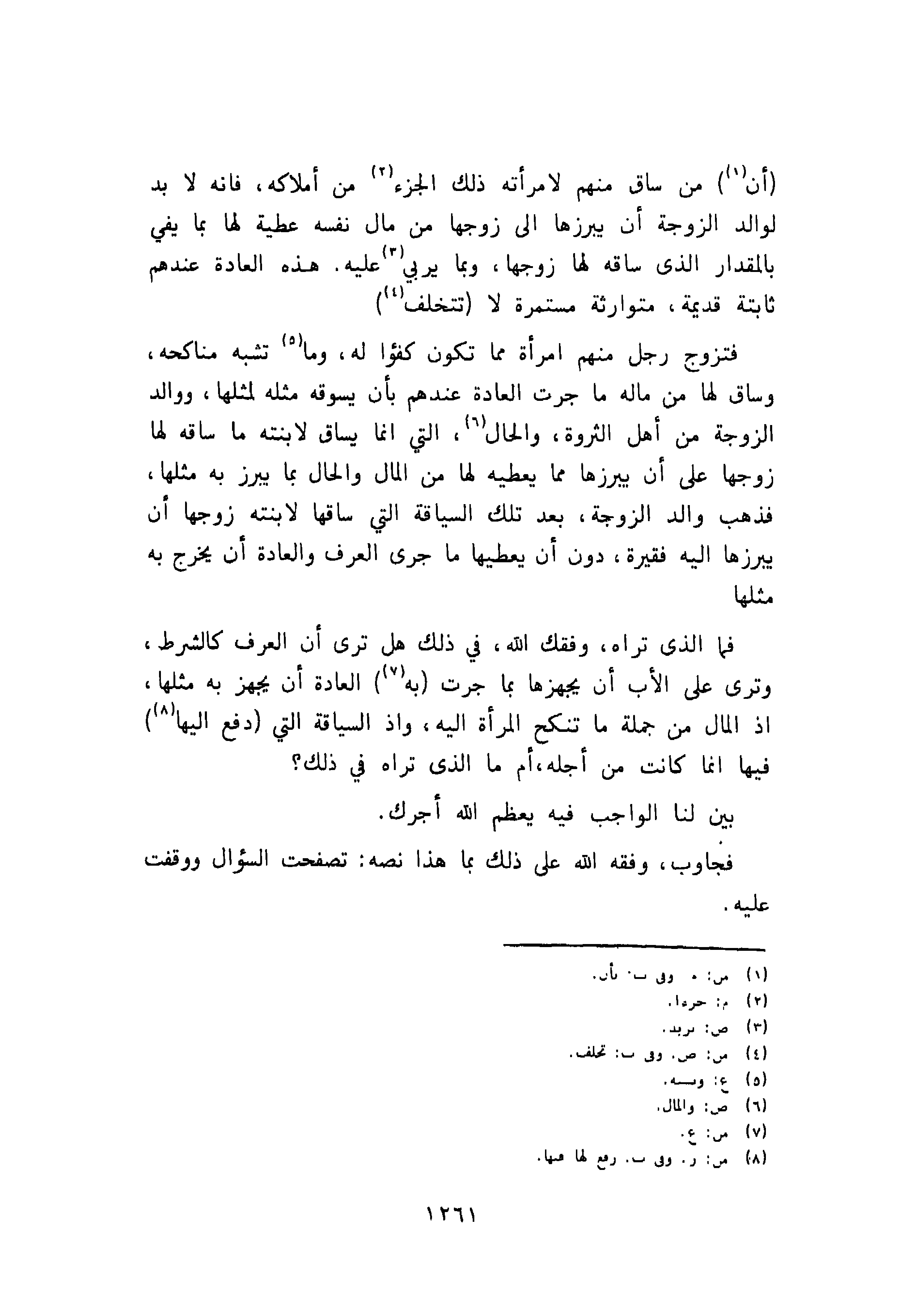 فتزوج رجل منهم امرأة مما تكون كفؤا له، وما تشبه مناكحه، وساق لها من ماله ما جرت العادة عندهم بأن يسوقه مثله لمثلها، ووالد الزوجة من أهل الثروة، والحال، التي إنما يساق لابنته ما ساقه لها زوجها على أن يبرزها مما يعطيه لها من المال والحال بنا يبرز به مثلها، فذهب والد الزوجة، بعد تلك السياقة التي ساقها لابنته زوجها أن يبرزها إليه فقيرة، دون أن يعطيها ما جرى العرف والعادة أن يخرج به مثلها.