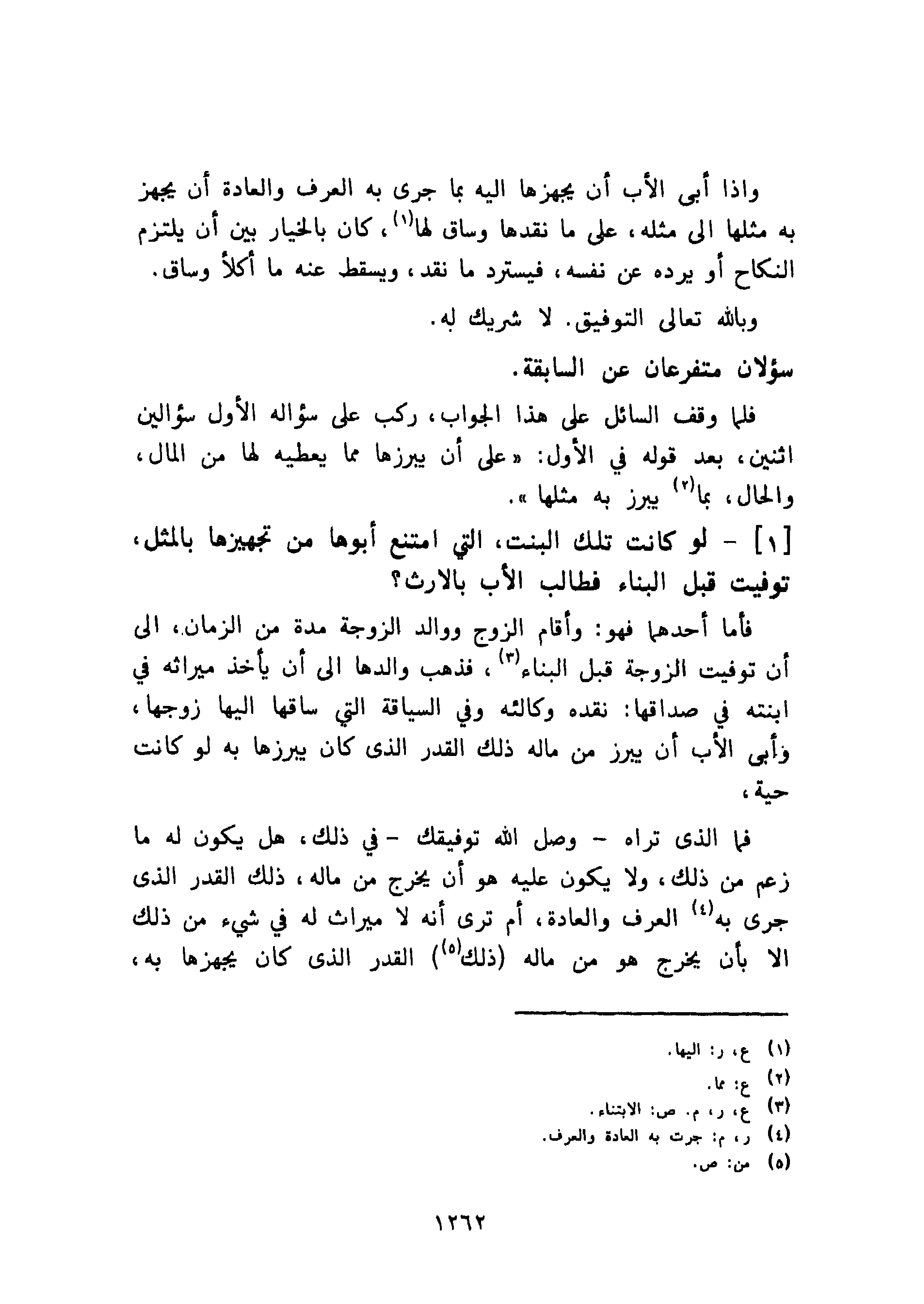 فلما وقف السائل على هذا الجواب، ركب على سؤاله الأول سؤالين اثنين، بعد قوله في الأول: " على أن يبرزها مما يعطيه لها من المال، والحال، بما يبرز به مثلها ".