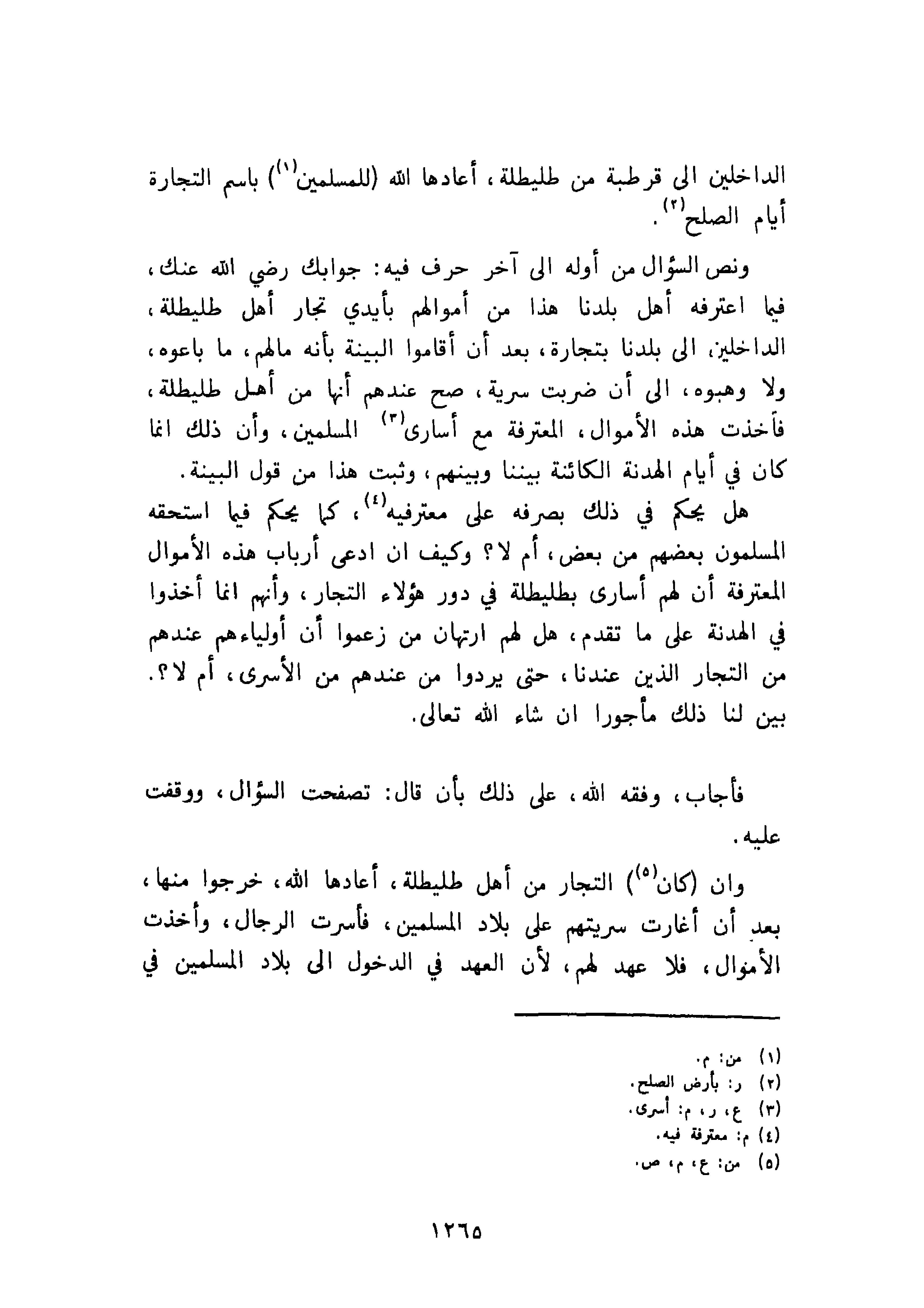 ونص السؤال من أوله إلى آخر حرف فيه: جوابك رضي الله عنك، فيما اعترفه أهل بلدنا هذا من أموالهم بأيدي تجار أهل طليطلة، الداخلين إلى بلدنا بتجارة، بعد أن أقاموا البينة بأنه مالهم، ما باعوه، ولا وهبوه، إلى أن ضربت سرية، صح عندهم أنها من أهل طليطلة، فأخذت هذه الأموال، المعترفة مع أسارى المسلمين، وأن ذلك إنما كان في أيام الهدنة الكائنة بيننا وبينهم، وثبت هذا من قول البينة.