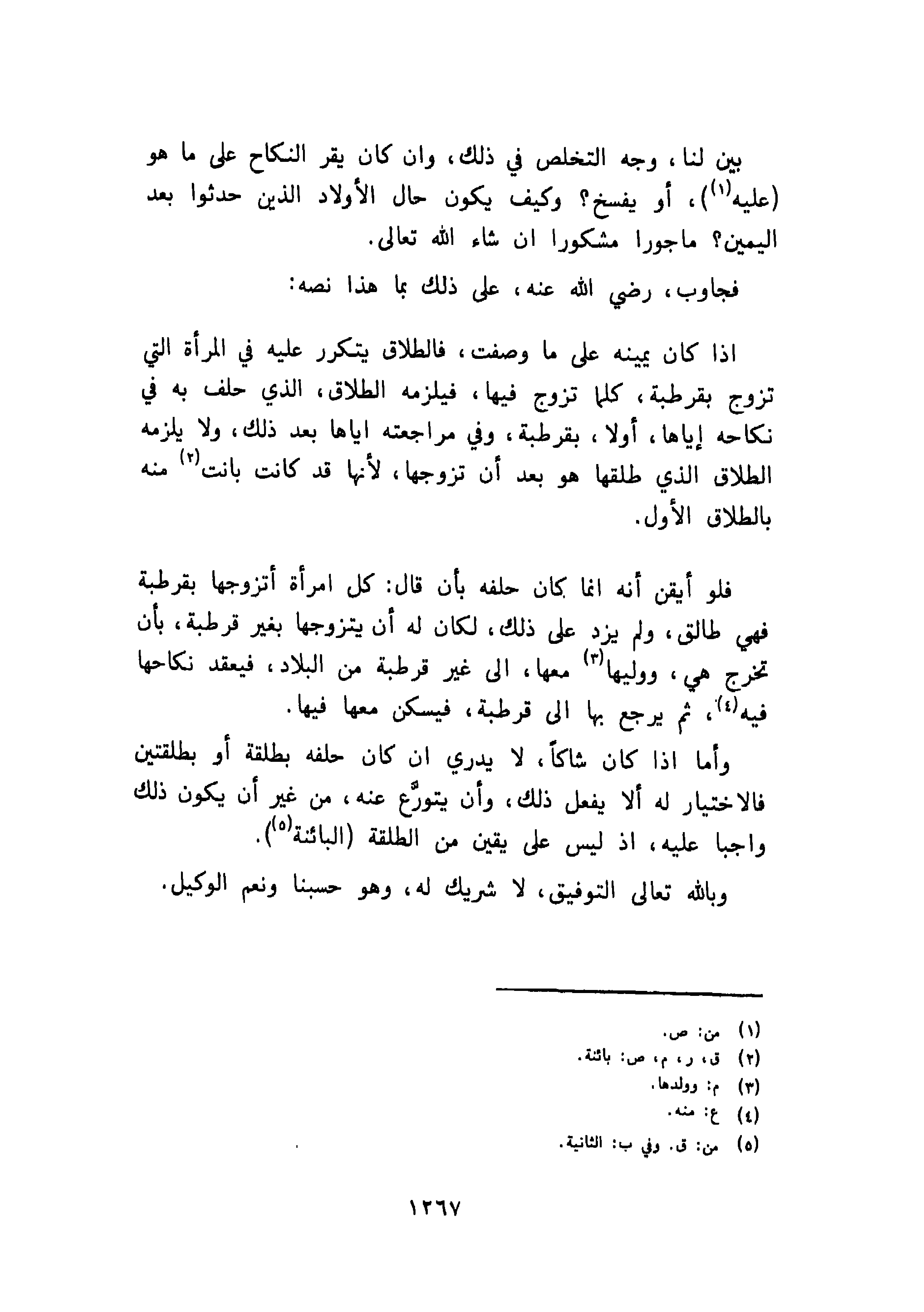 إذا كان يمينه على ما وصفت، فالطلاق يتكرر عليه في المرأة التي تزوج بقرطبة، كلما تزوج فيها، فيلزمه الطلاق، الذي حلف به في نكاحه إياها، أولا، بقرطبة، وفي مراجعته إياها بعد ذلك، ولا يلزمه الطلاق الذي طلقها هو بعد أن تزوجها، لأنها قد كانت بانت منه بالطلاق الأول.