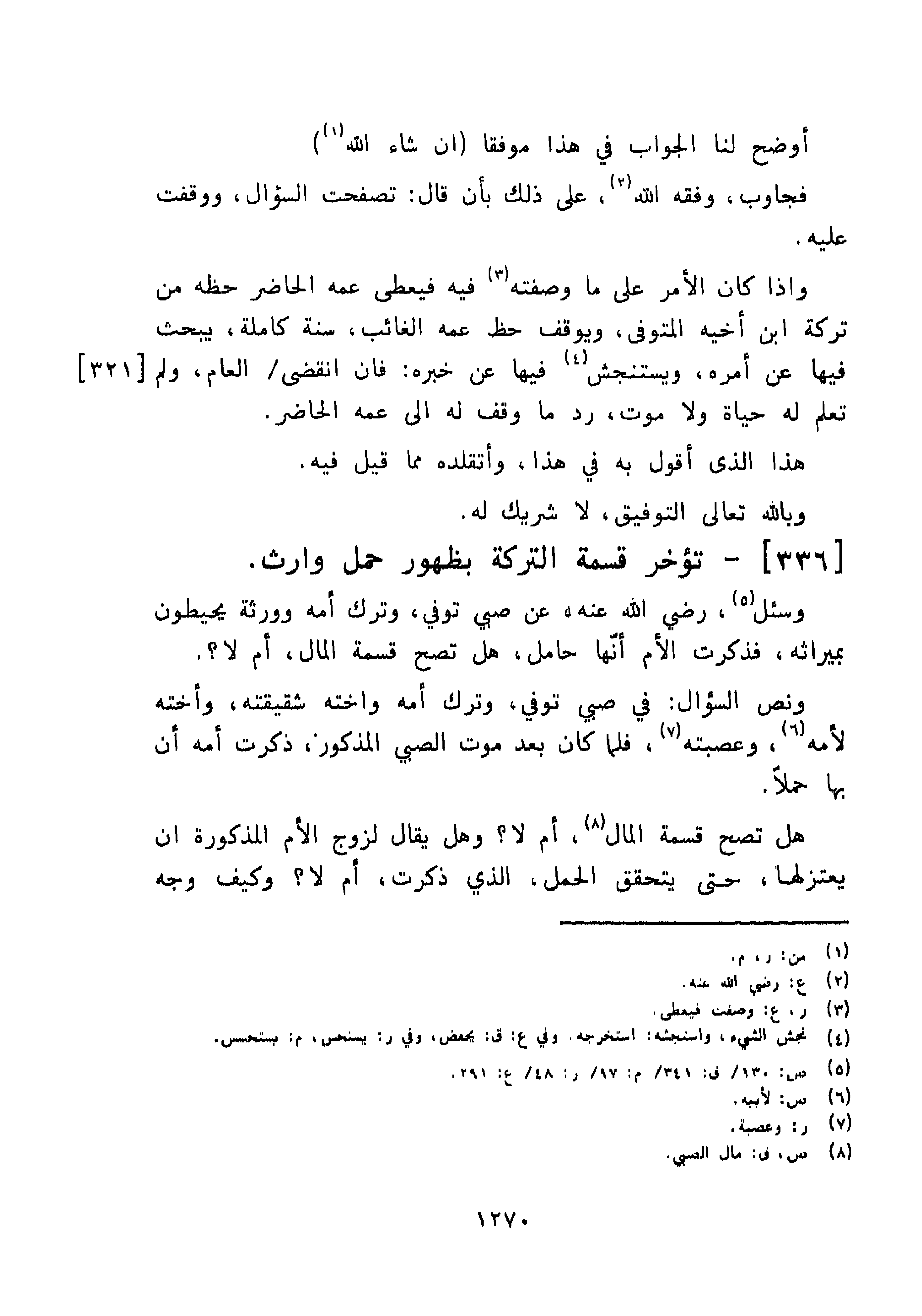 وسئل، رضي الله عنه، عن صبي توفي، وترك وورثة يحيطون بميراثه، فذكرت الأم أنَّها حامل، هل تصح قسمة المال، أم لا؟.