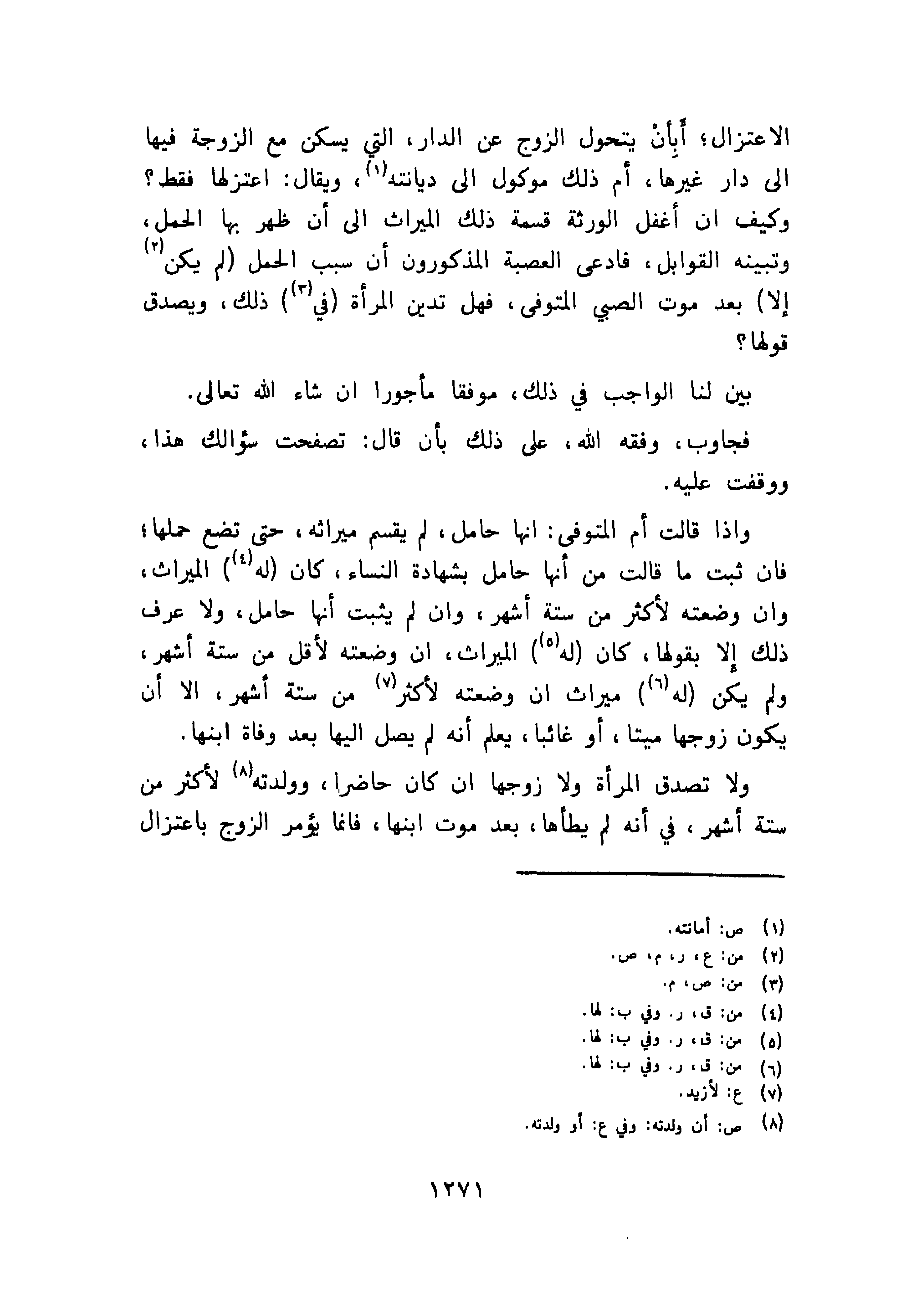 الاعتزال؛ أَبِأنْ يتحول الزوج عن الدار، التي يسكن مع الزوجة فيها إلى دار غيرها، أم ذلك موكول إلى ديانته، ويقال: اعتزلها فقط؟ وكيف إن أغفل الورثة قسمة ذلك الميراث إلى أن ظهر بها الحمل، وتبينه القوابل، فادعى العصبة المذكورون أن سبب الحمل لم يكن إلا بعد موت الصبي المتوفى، فهل تدين المرأة في بذلك، ويصدق قولها؟