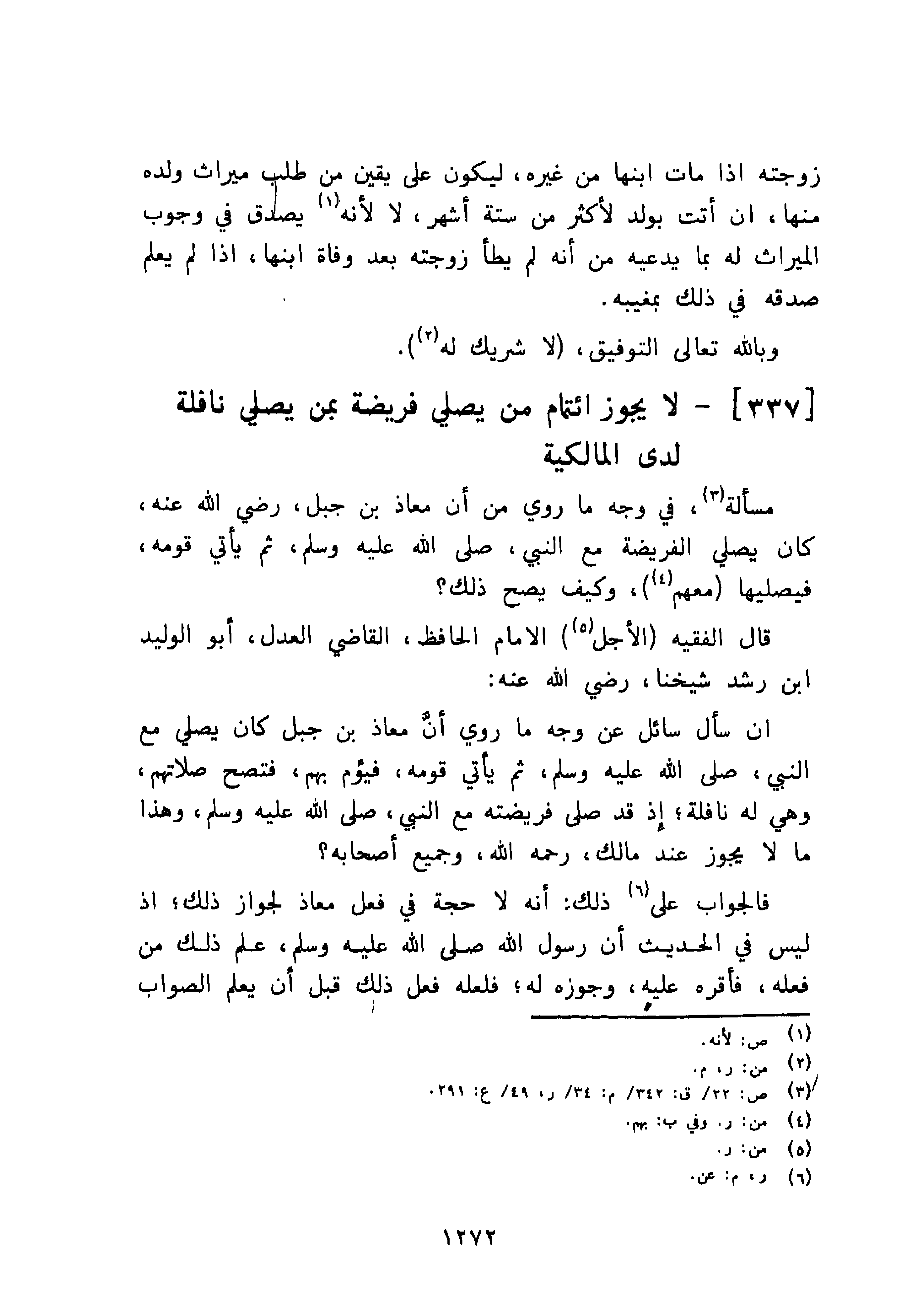 إن سأل سائل عن وجه ما روي أنَّ معاذ بن جبل كان يصلي مع النبي صلى الله عليه وسلم، ثم يأتي قومه، فيؤم بهم، فتصح صلاتهم، وهي له نافلة؛ إذ قد صلى فريضته مع النبي صلى الله عليه وسلم، وهذا ما لا يجوز عند مالك، رحمه الله، وجميع أصحابه؟