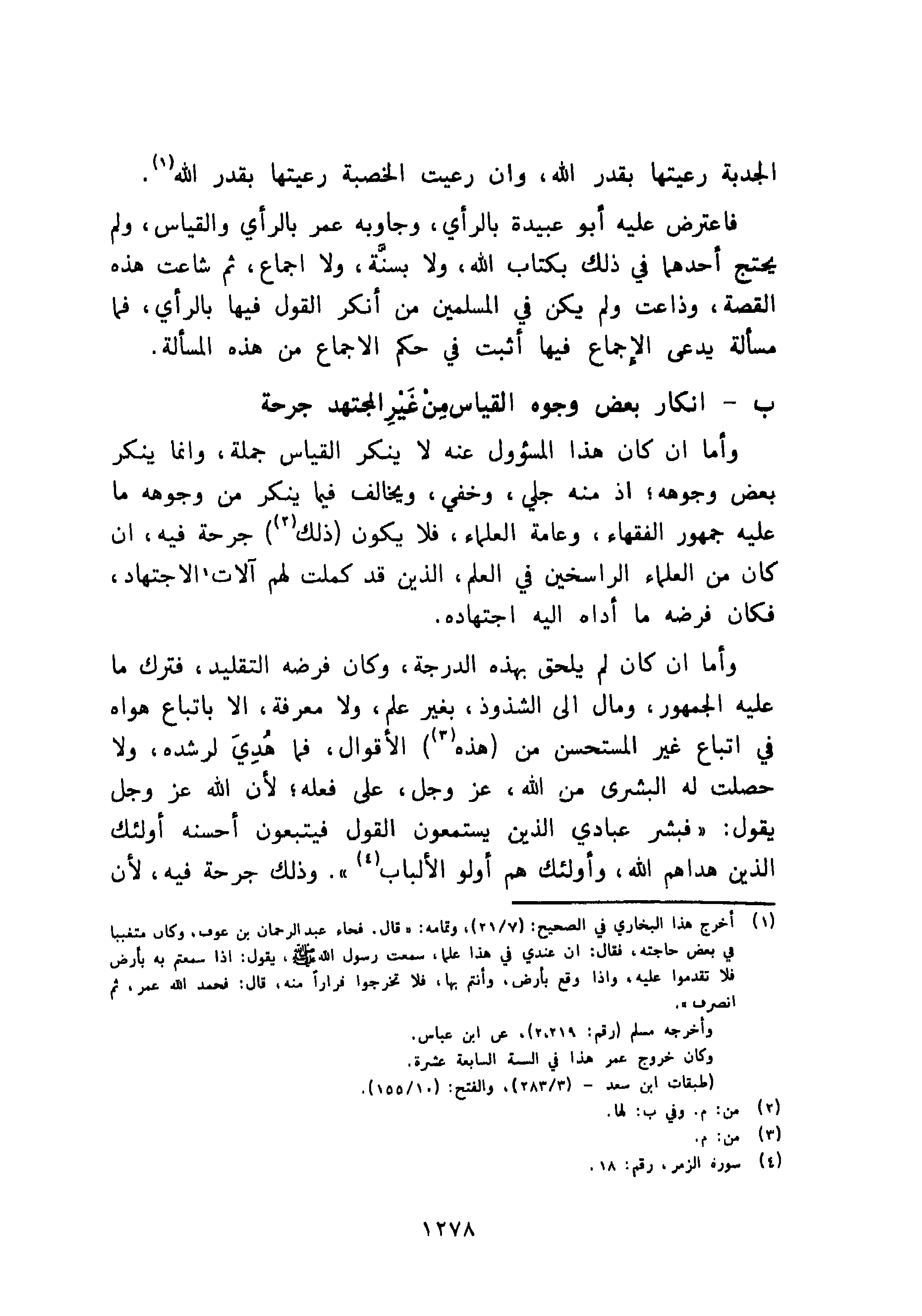 فاعترض عليه أبو عبيدة بالرأي، وجاوبه عمر بالرأي والقياس، ولم يحتج أحدهما في ذلك بكتاب الله، ولا بسنَّة، ولا إجماع، ثم شاعت هذه القصة، وذاعت ولم يكن في المسلمين من أنكر القول فيها بالرأي، فما مسألة يدعى الإجماع فيها أثبت في حكم الإجماع من هذه المسألة.