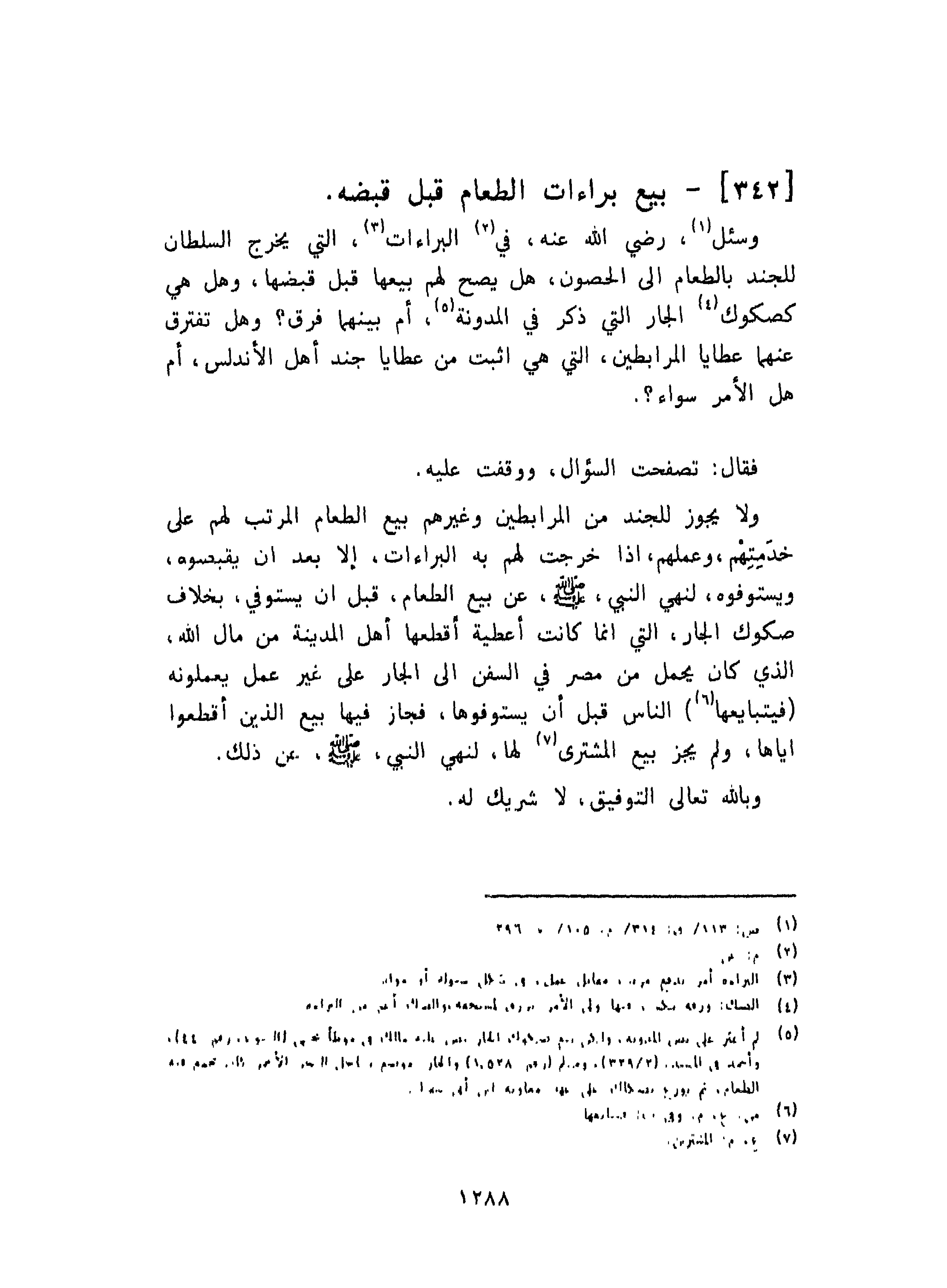 ولا يجوز للجند من المرابطين وغيرهم بيع الطعام المرتب لهم على خدمتهم، وعملهم، إذا خرجت لهم به البراءات، إلا بعد أن يقبضوه، ويستوفوه، لنهي النبي صلى الله عليه وسلم عن بيع الطعام، قبل أن يستوفي، بِخلاف صكوك الجار، التي إنما كانت أعطية أقطعها أهل المدينة من مال الله، الذي كان يحمل من مصر في السفن إلى الجار على غير عمل يعملونه فيتبايعها الناس قبل أن يستوفوها، فجاز فيها بيع الذين أقطعوا إياها، ولم يجز بيع المشترى لها، لنهي النبي صلى الله عليه وسلم عن ذلك.