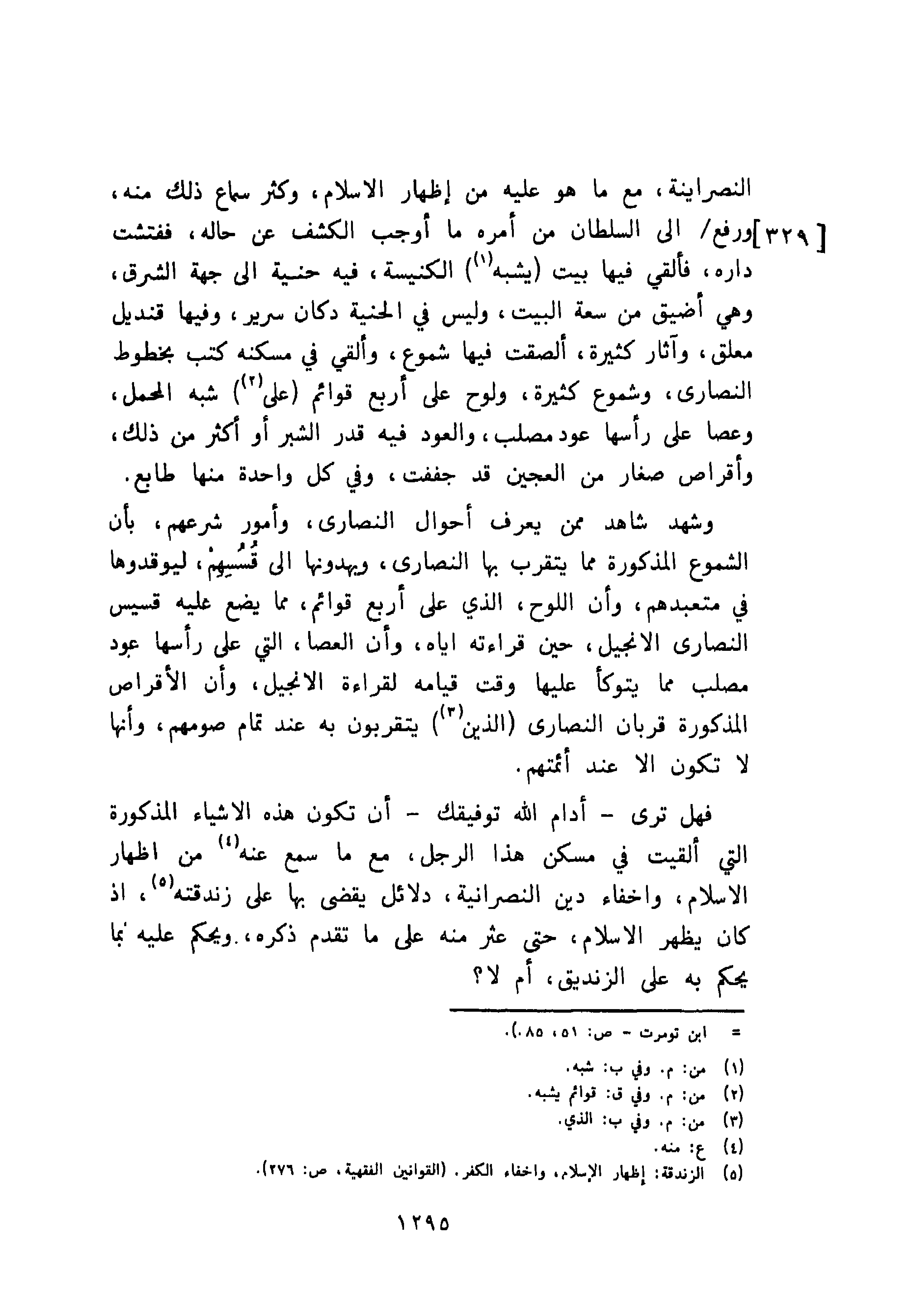 فهل ترى - أدام الله توفيقك - أن تكون هذه الأشياء المذكورة التي ألقيت في مسكن هذا الرجل، مع ما سمع عنه من إظهار الإسلام، وإخفاء دين النصرانية، دلائل يقضى بها على زندقته، إذ كان يظهر الإسلام، حتى عثر منه على ما تقدم ذكره، ويحكم عليه بما يحكم به على الزنديق، أم لا؟