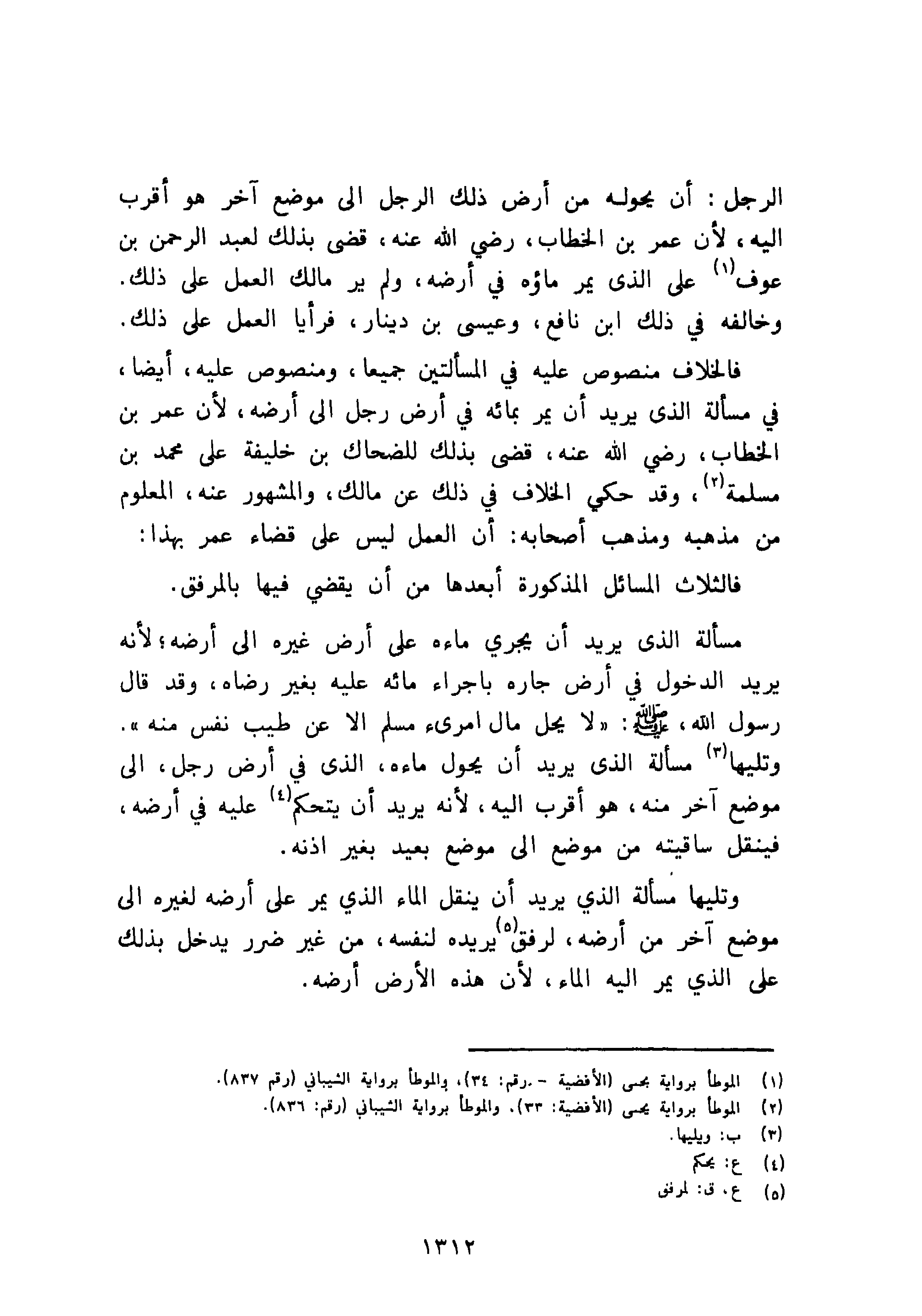 مسألة الذي يريد أن يجري ماءه على أرض غيره إلى أرضه؛ لأنه يريد الدخول في أرض جاره بإجراء مائه عليه بغير رضاه، وقد قال رسول الله، صلى الله عليه وسلم: " لا يحل ما امريء مسلم إلا عن طيب نفس منه ". وتليها مسألة الذي يريد أن يحول ماءه، الذي في أرض رجل، إلى موضع آخر منه، هو أقرب إليه، لأنه يريد أن يتحكم عليه في أرضه، فينقل ساقيته من موضع إلى موضع بعيد بغير إذنه.
