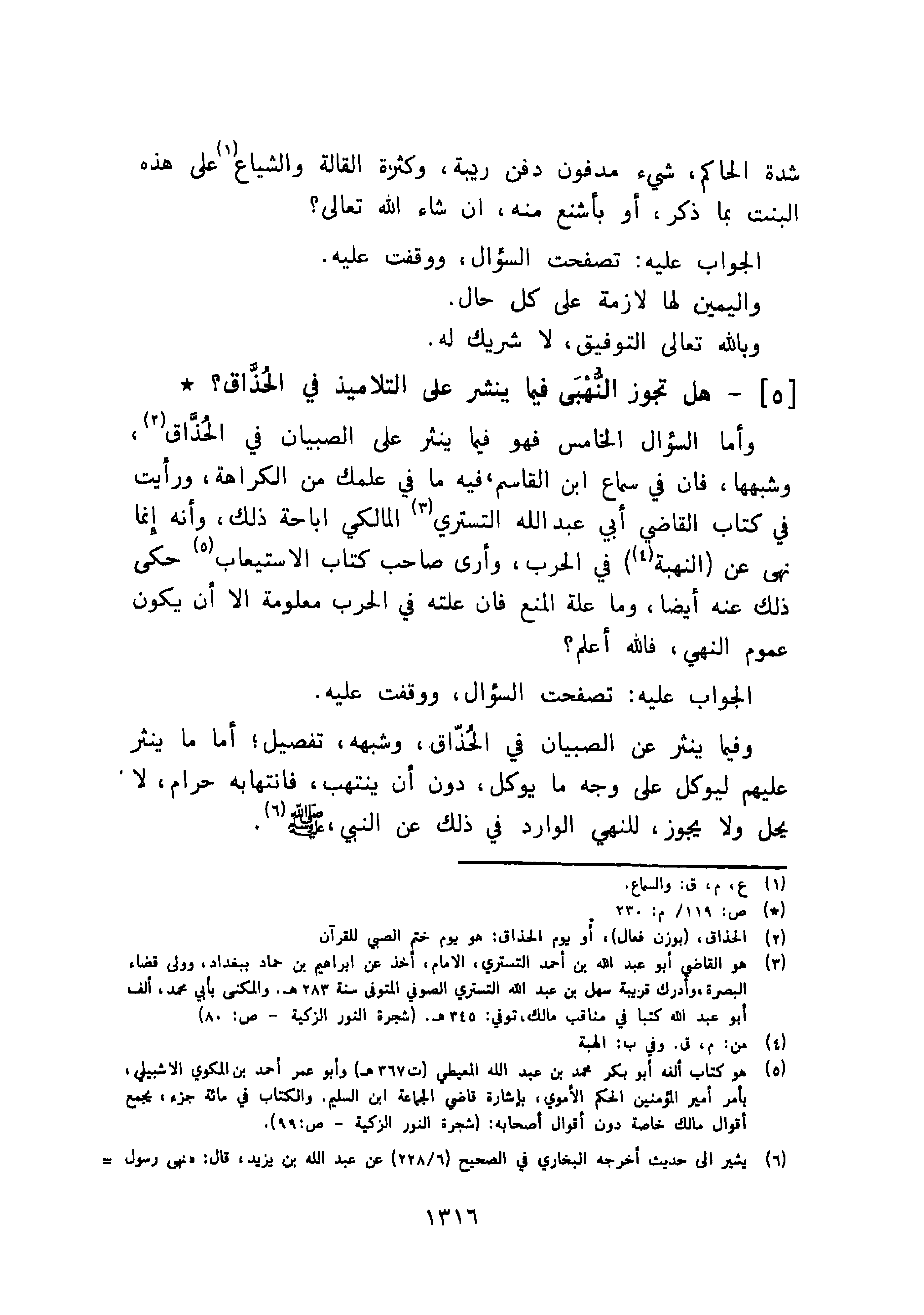وأما السؤال الخامس فهو فيما ينثر على الصبيان في الحُذَّاق، وشبهها، فإن في سماع ابن القاسم، فيه ما في علمك من الكراهة، ورأيت في كتاب القاضي أبي عبد الله التستري المالكي إباحة ذلك، وأنه إنما نهى عن النهبة في الحرب، وأرى صاحب كتاب الاستيعاب حكى ذلك عنه أيضا، وما علة المنع فإن علته في الحرب معلومة إلا أن يكون عموم النهي، فالله أعلم؟