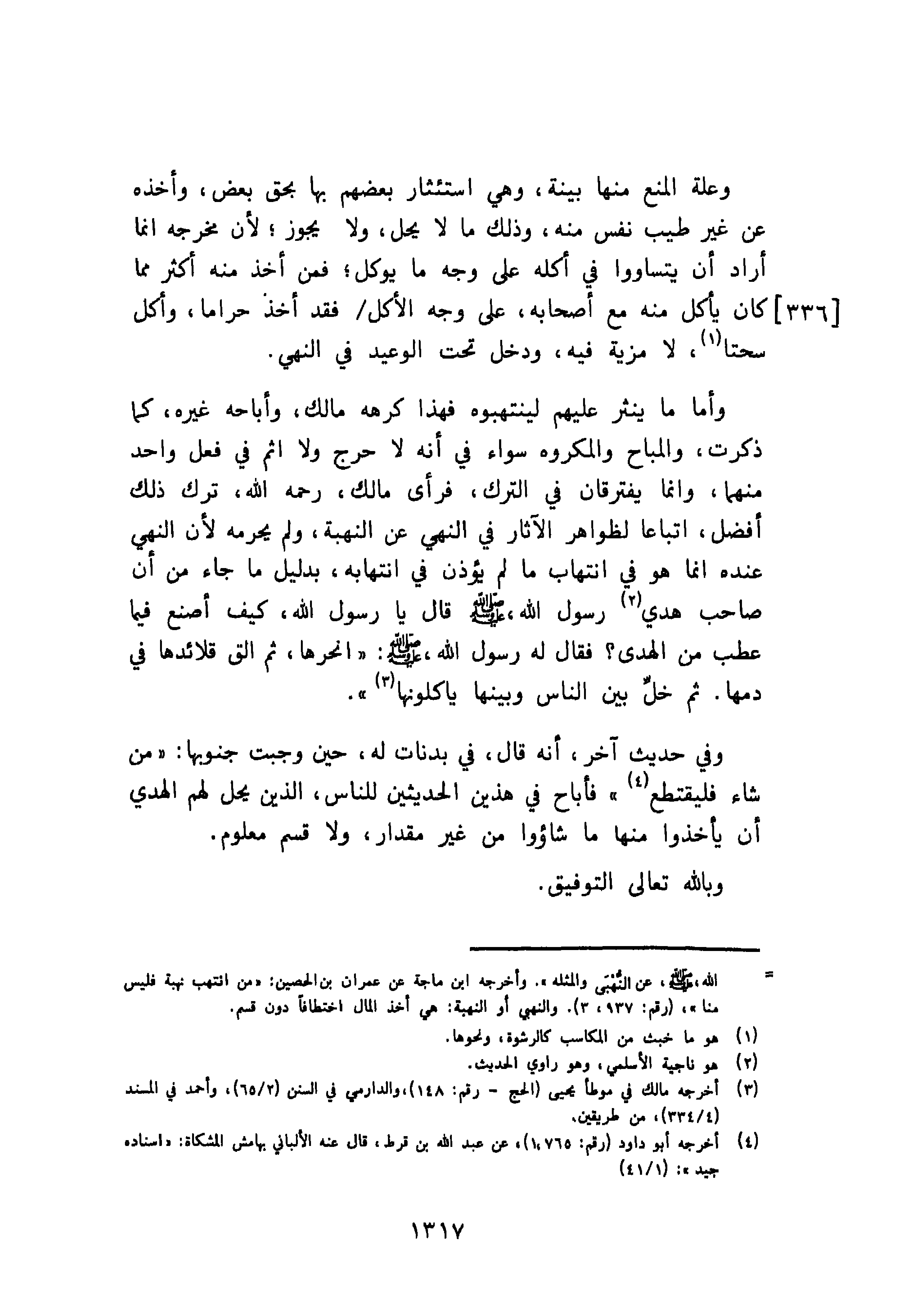 وعلى المنع منها بينة، وهي استئثار بعضهم بها بحق بعض، وأخذه عن غير طيب نفس منه، وذلك ما لا يحل، ولا يجوز؛ لأن مخرجه إنما أراد أن يتساووا في أكله على وجه ما يوكل؛ فمن أخذ منه أكثر مما كان يأكل منه مع أصحابه، على وجه الأكل فقد أخذ حراما، وأكل سحتا، لا مزية فيه، ودخل تحت الوعيد في النهي.