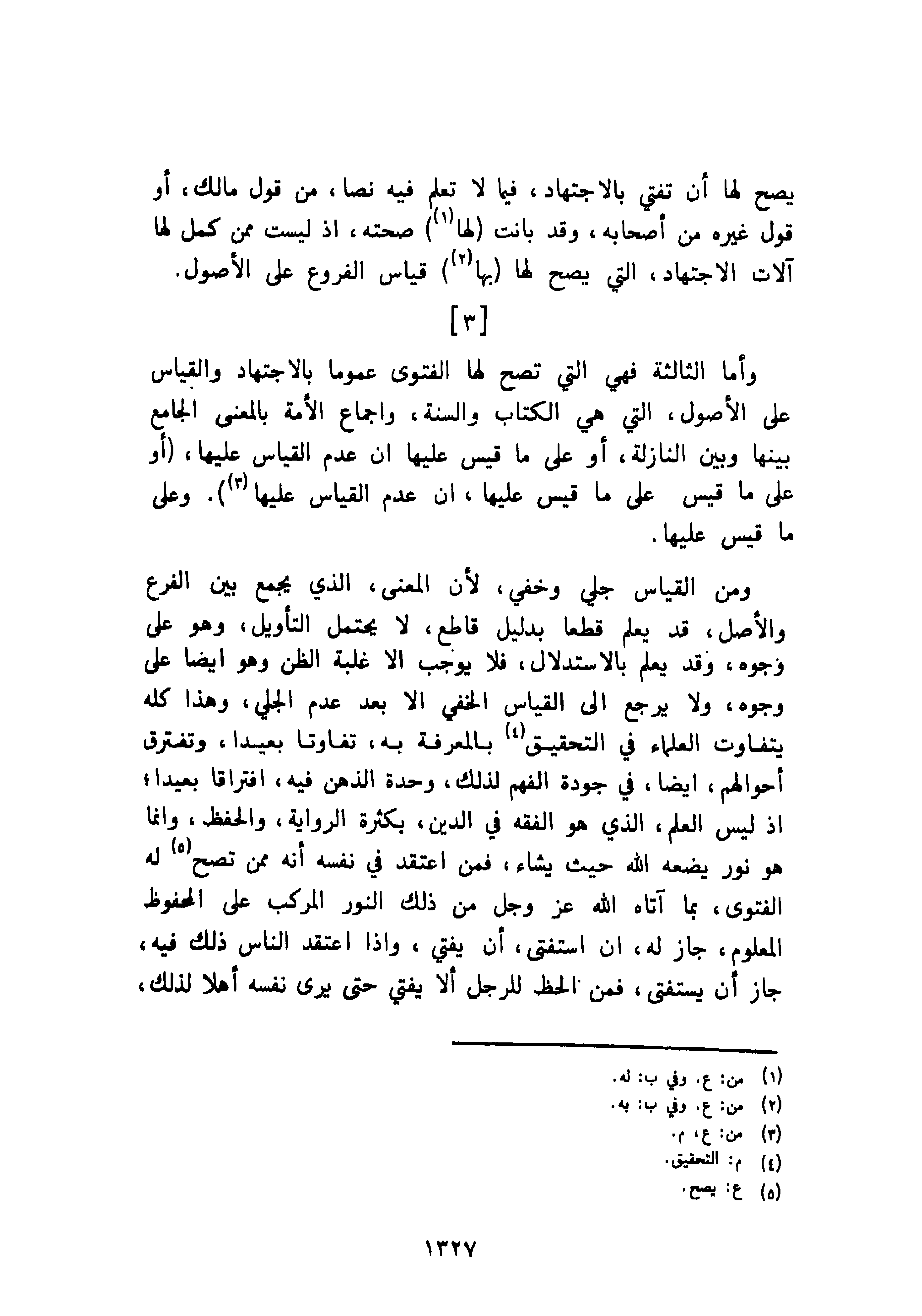 وأما الثالثة فهي التي تصح لها الفتوى عموما بالاجتهاد والقياس على الأصول، التي هي الكتاب وا السنة، وإجماع الأمة بالمعنى الجامع بينها وبين النازلة، أو على ما قيس عليها إن عدم القياس عليها، أو على ما قيس على ما قيس عليها، إن عدم القياس عليها. وعلى ما قيس عليها.