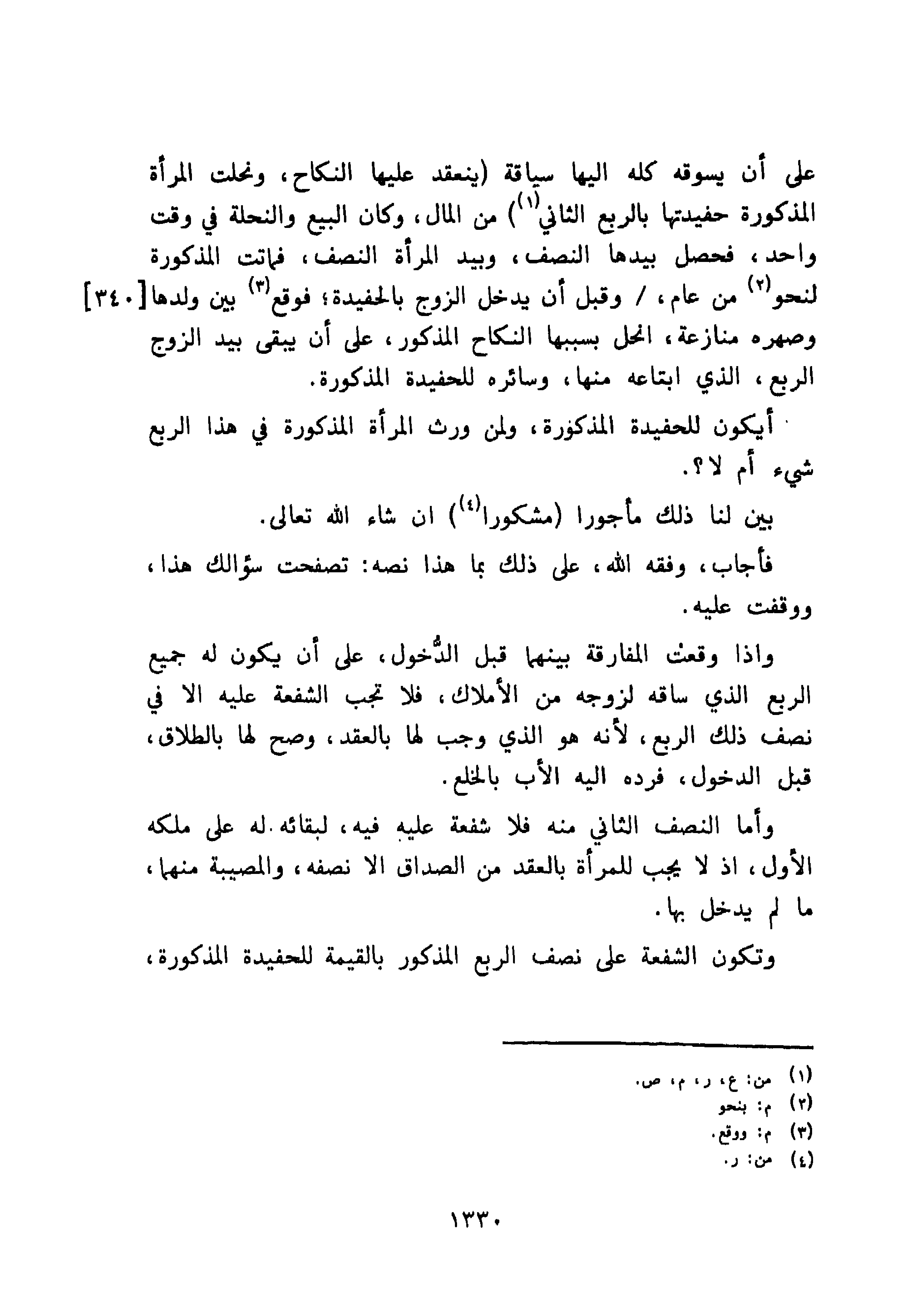 على أن يسوقه كله إليها سياقة ينعقد عليها النكاح، ونحلت المرأة المذكورة حفيدتها بالربع الثاني من المال، وكان البيع والنحلة في وقت واحد، فحصل بيدها النصف، وبيد المرأة النصف، فماتت المذكورة لنحو من عام، وقبل أن يدخل الزوج بالحفيدة؛ فوقع بين ولدها وصهره منازعة، انحل بسببها النكاح المذكور، على أن يبقى بيد الزوج الربع، الذي ابتاعه منها، وسائره للحفيدة المذكورة.