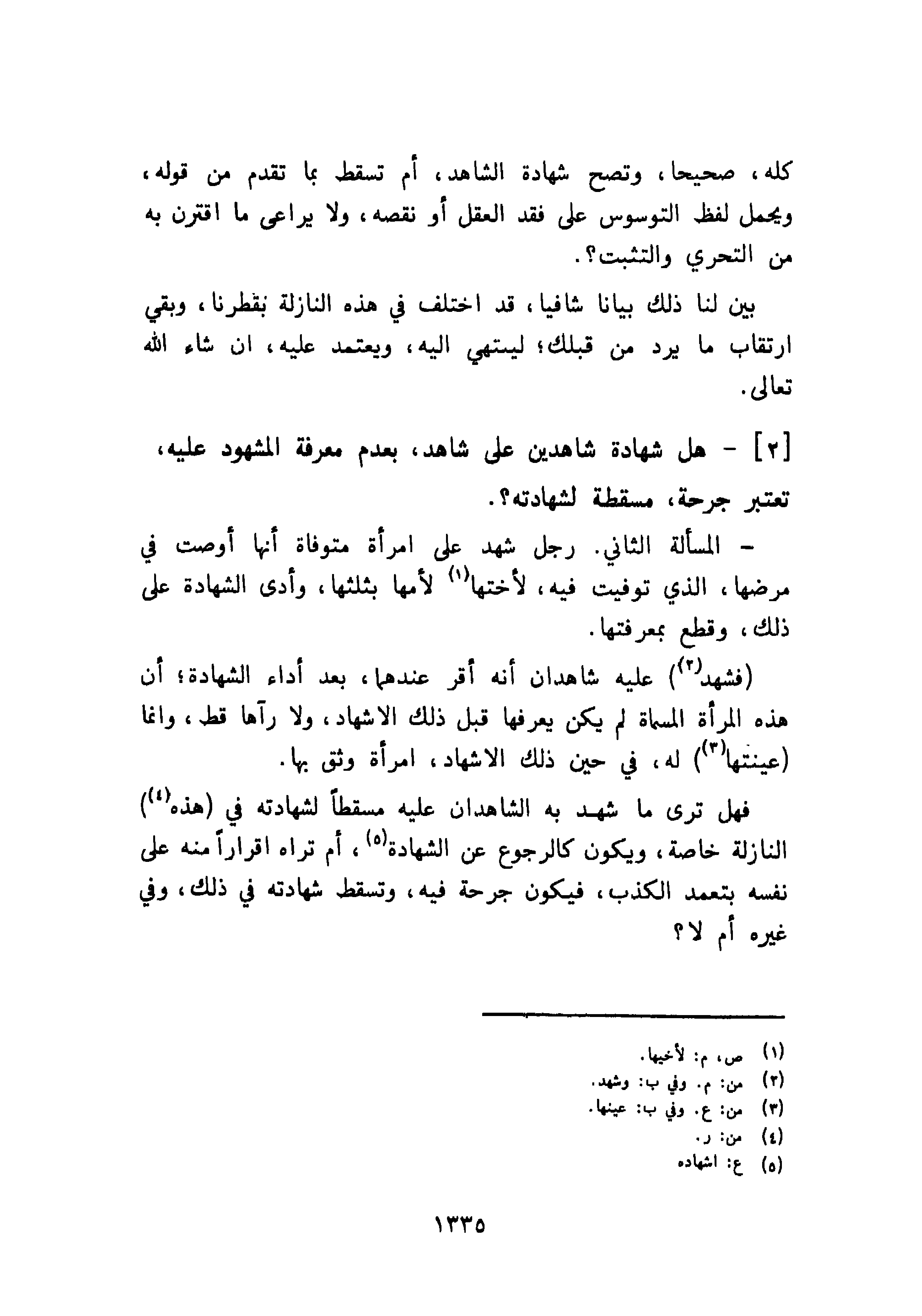 - المسألة الثانية. رجل شهد على امرأة متوفاة أنها أوصت في مرضها، الذي توفيت فيه، لأختها لأمها بثلثها، وأدى الشهادة على ذلك، وقطع بمعرفتها.