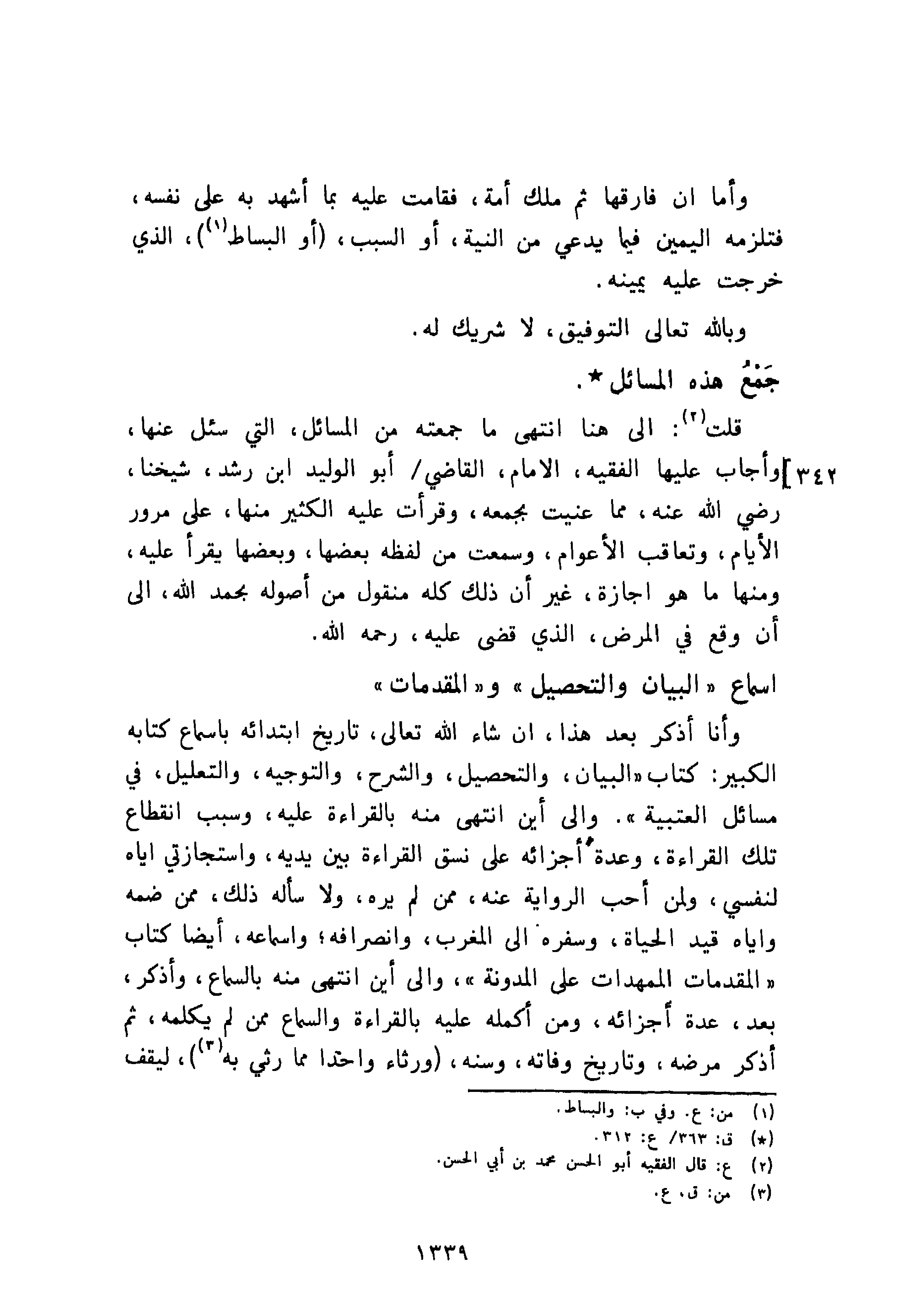 قلت: إلى هنا انتهى ما جمعته من المسائل، التي سئل عنها، وأجاب عليها الفقيه، الإمام، القاضي أبو الوليد ابن رشد، شيخنا، رضي الله عنه، مما عنيت بجمعه، وقرأت عليه الكثير منها، على مرور الأيام، وتعاقب الأعوام، وسمعت من لفظه بعضها، وبعضها يقرأ عليه، ومنها ما هو إجازة، غير أن ذلك كله منقول من أصوله بحمد الله، إلى أن وقع في المرض، الذي قضى عليه، رحمه الله.