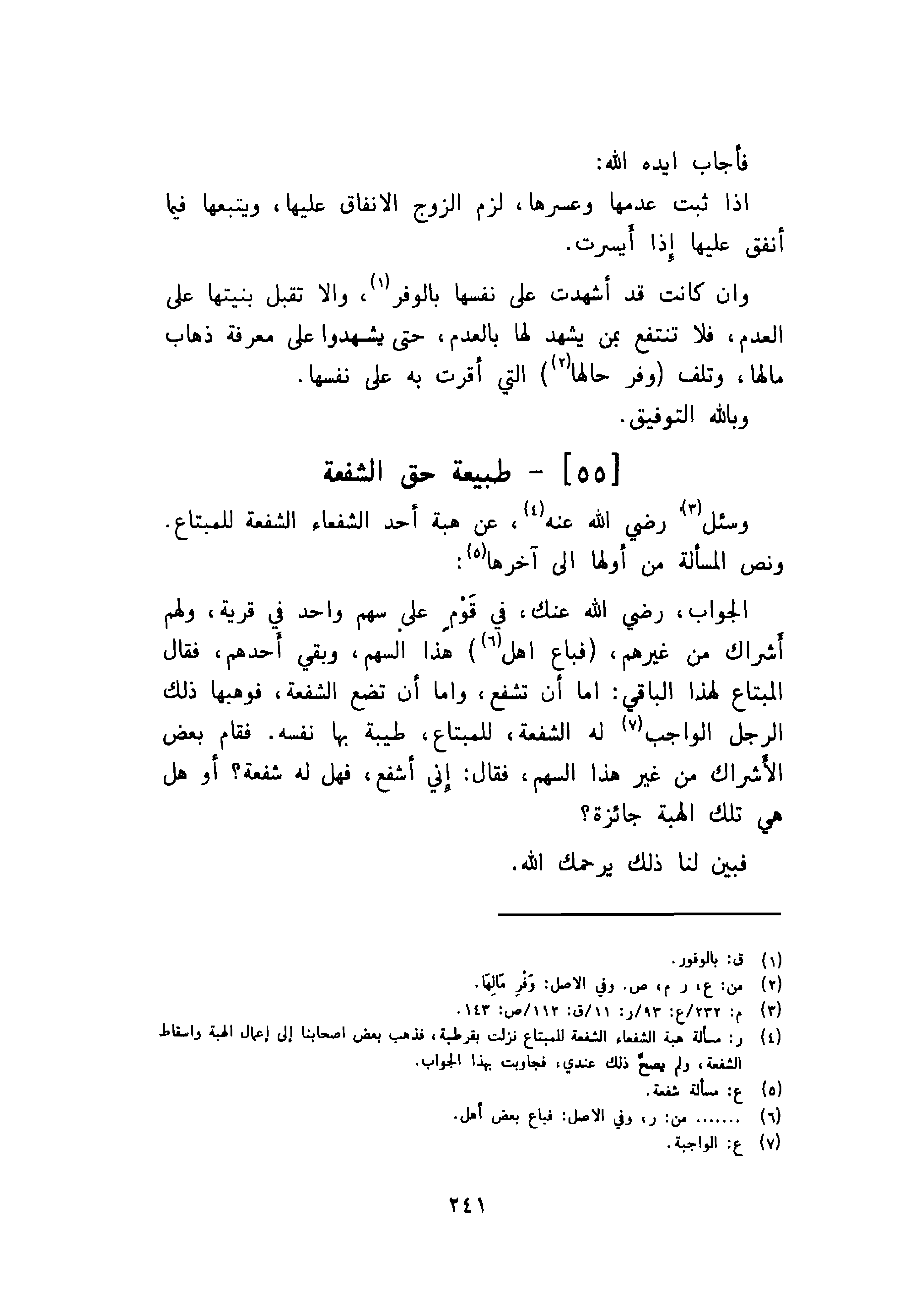 الجواب، رضي الله عنك، في قوم سهم واحد في قرية، ولهم أشراك من غيرهم، فباع اهل هذا السهم وبقي أحدهم، فقال المبتاع لهذا الباقي: اما أن تشفع، واما أن تضع الشفعة، فوهبها ذلك الرجل الواجب له الشفعة، للمبتاع، طيبة بها نفسه فقام بعض الأشرال من غير هذا السهم فقال: إني أشفع، فهل له شفعة؟ أو هل هي تلك الهبة جائزة؟