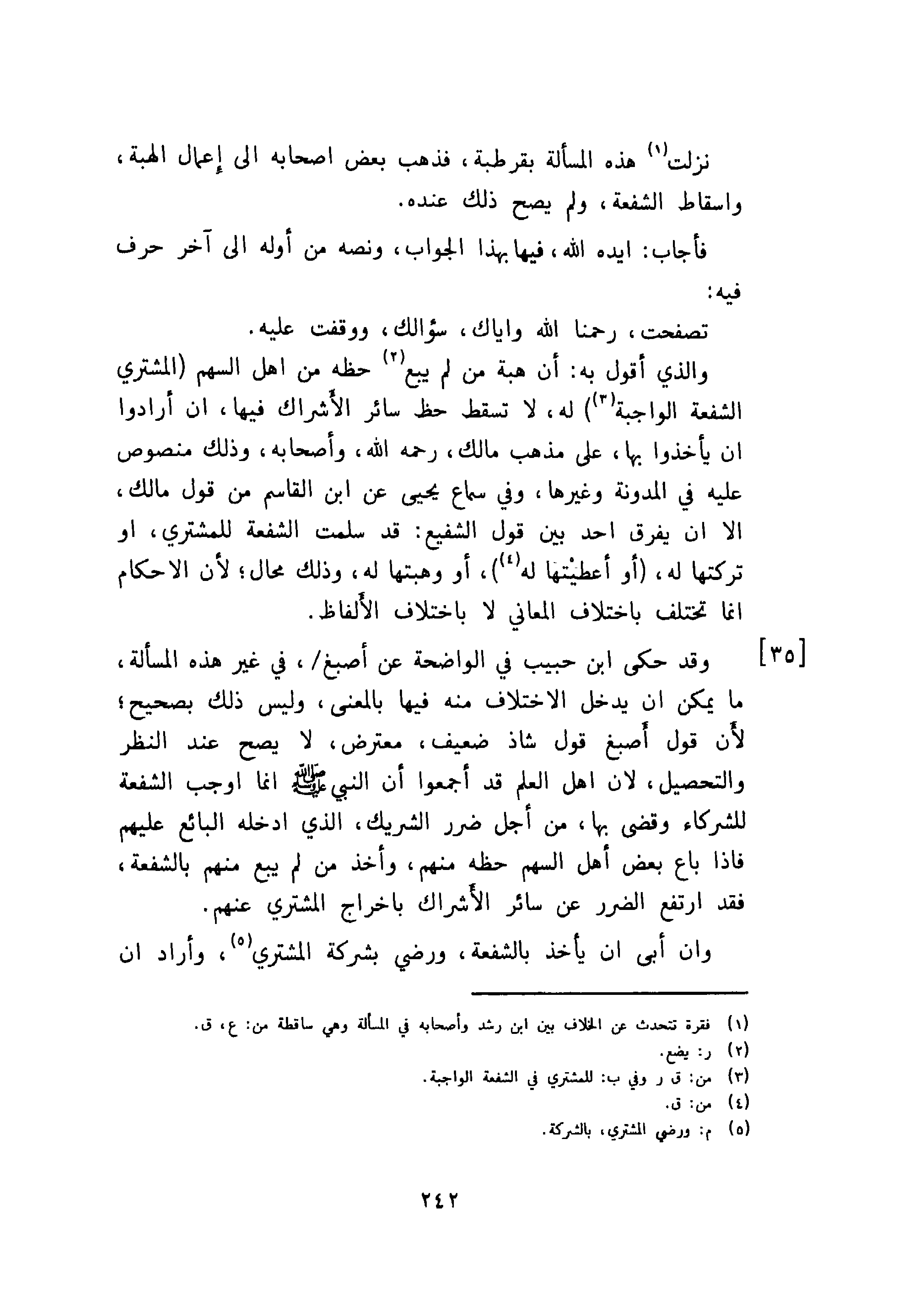 [35] وقد حكى ابن حبيب في الواضحة عن أصبغ، في غير هذه المسألة ما يمكن ان يدخل الاختلاف منه فيها بالمعنى، وليس ذلك بصحيح لأن قول أصبغ قول شاذ ضعيف، معترض، لا يصح عند النظر والتحصيل، لان أهل العلم قد أجمعوا أن النبي صلى الله عليه وسلم انما اوجب الشفعة للشركاء، وقضى بها من أجل ضرر الشريك، الذي ادخله البائع عليهم فاذا باع أهل السهم حظه منهم وأخذ من لم يبع منهم بالشفعة، فقد ارتفع الضرر عن سائر الأشراك باخراج المشتري عنهم وان أبي ان يأخذ بالشفعة، ورضي بشركة المشتري وأراد ان