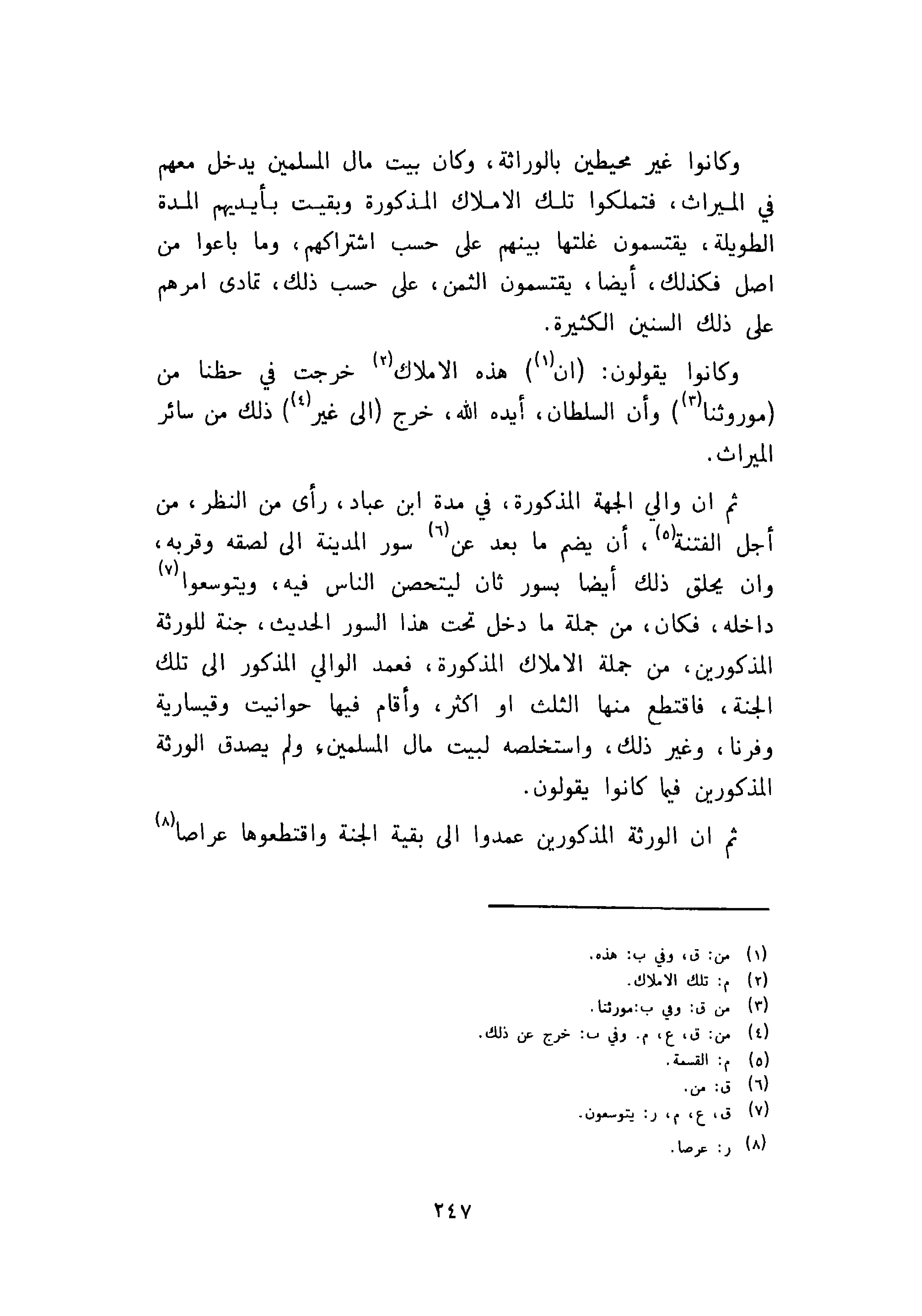 وكانوا غير محيطين بالوراثة، وكان بيت مال المسلمين يدخل معهم في الميراث، فتملكوا تلك الاملاك المذكورة وبقيت بأيديهم المدة الطويلة، يقتسمون غلتها بينهم على حسب اشتراكهم، وما باعوا من اصل فكذلك، أيضا، يقتسمون الثمن، على حسب ذلك، تمادى امرهم على ذلك السنين الكثيرة.