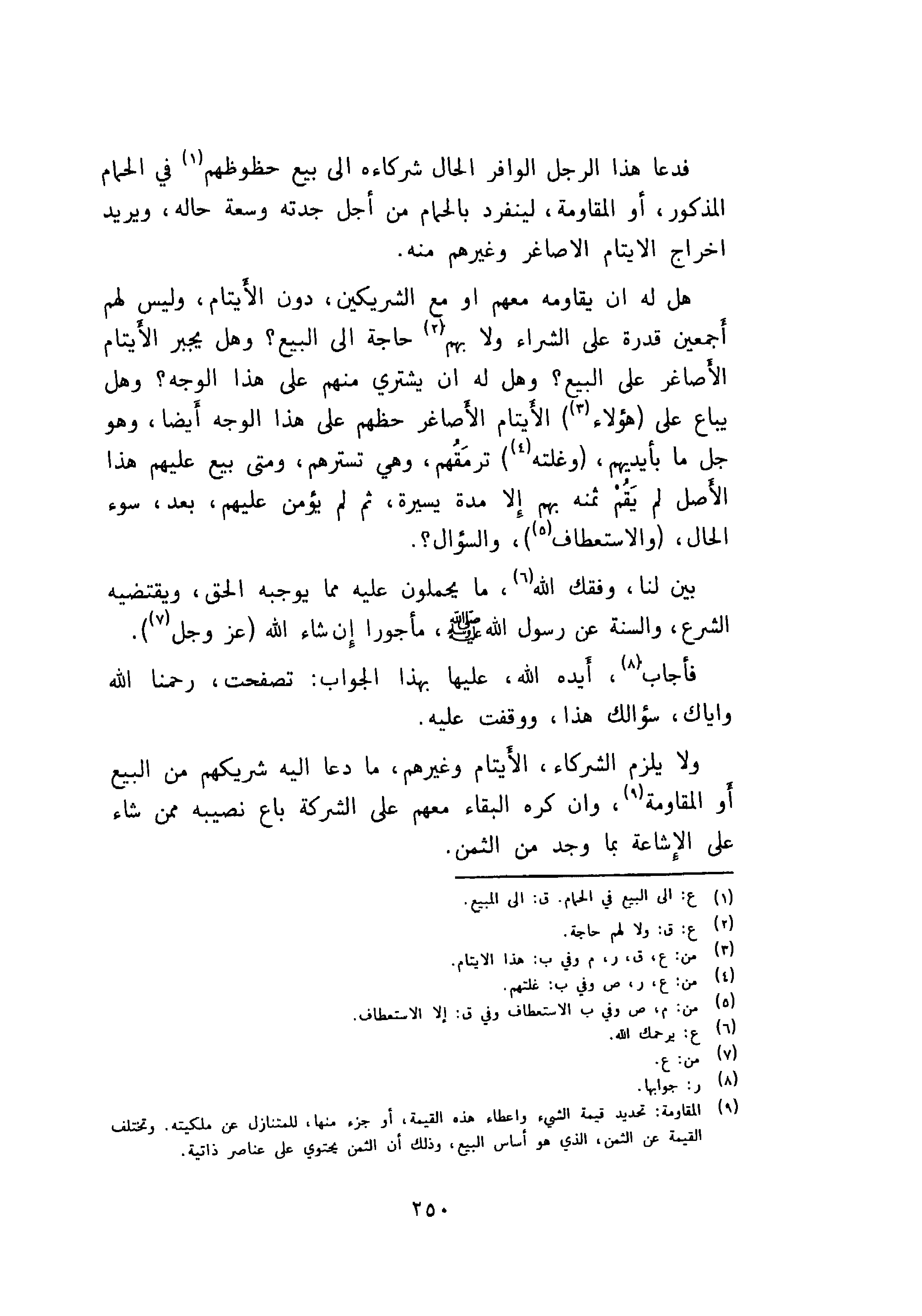 هل له ان يقاومة معهم او مع الشريكين، دون الأيتام، وليس لهم أجمعين قدرة على الشراء ولا بهم حاجة إلى البيع؟ وهل يجبر الأيتام الأصاغر على البيع؟ وهل له ان يشترى منهم على هذا الوجة أيضا، وهو جل ما بأيديهم، وغلته ترمقهم، وهى تسترهم، ومتى بيع عليهم هذات الأصل لم يقم ثمنه بهم إلا مدة يسيرة، ثم لم يؤمن عليهم، بعد، سوء الحال، والاستعطاف، والسؤال؟.