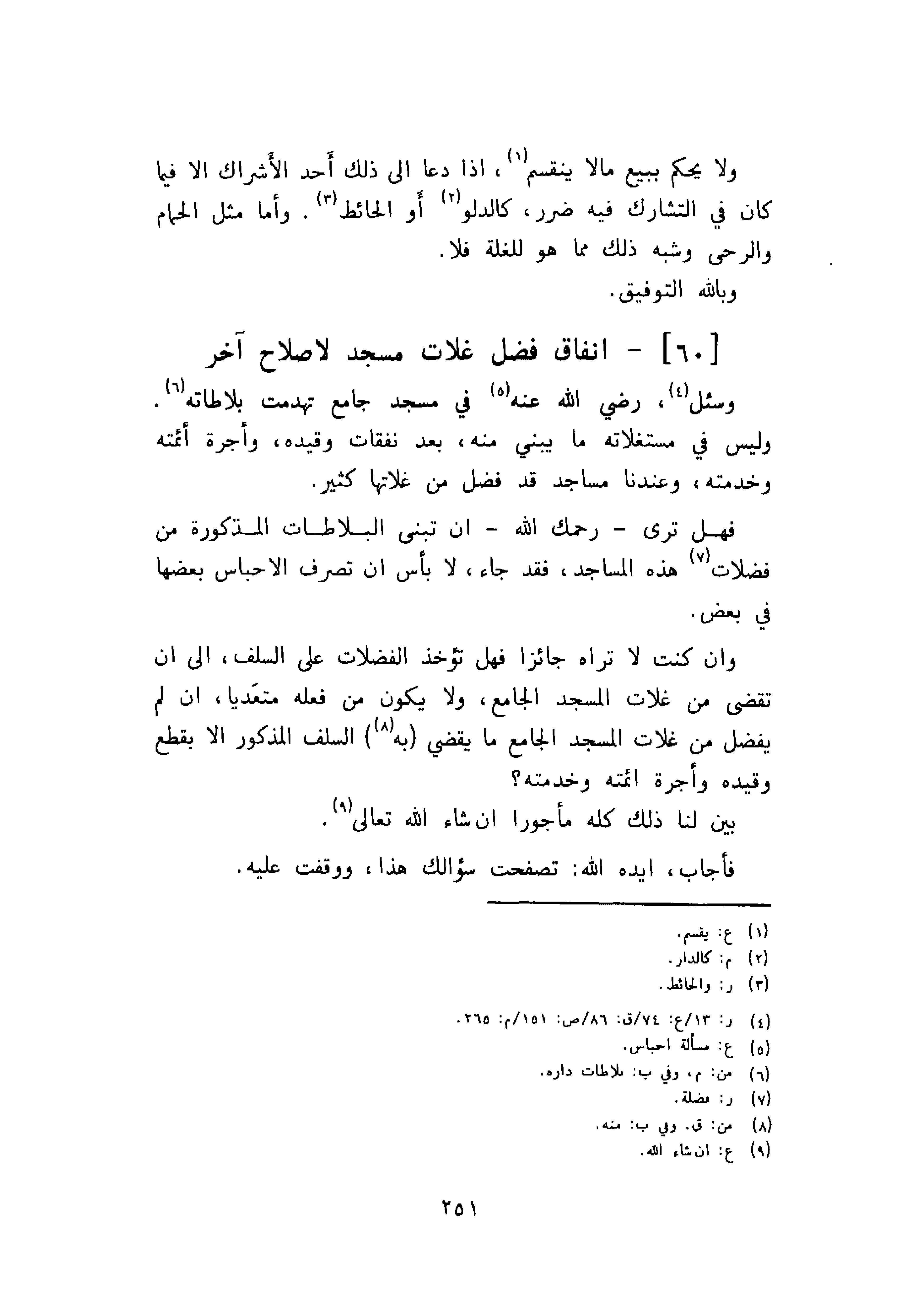 فهل ترى - رحمك الله - ان تبنى البلاطات المذكورة من فضلات هذه المساجد، فقد جاء، لا بأس ان تصرف الاحباس بعضها في بعض.