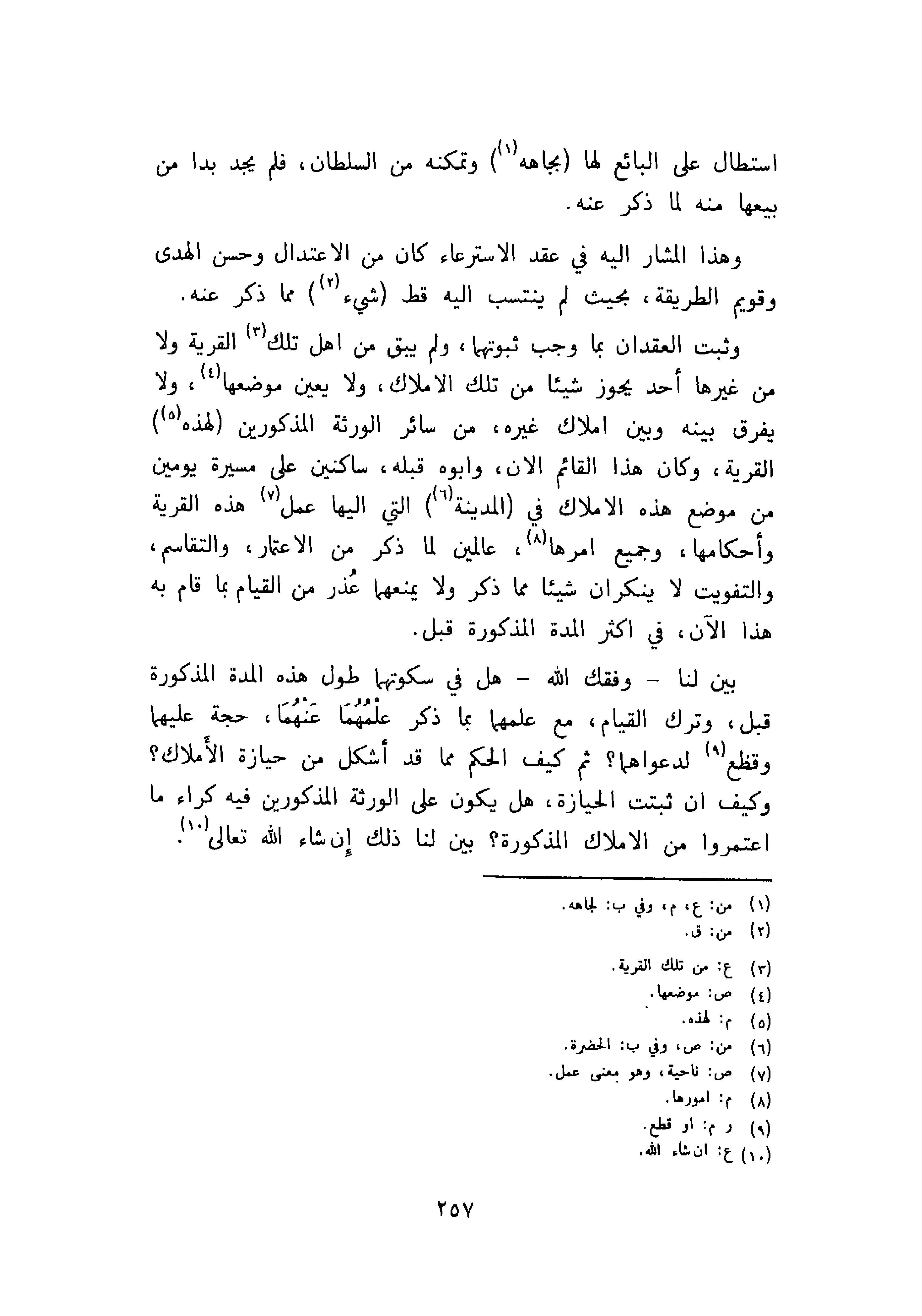 وثبت العقدان بما وجب ثبوتهما، ولم يبق من اهل تلك القرية ولا من غيرها أحد يحوز شيئاً من تلك الاملاك، ولا يعين موضعها، ولا يفرق بينه وبين املاك غيره، من سائر الورثة المذكرورين لهذه القرية، وكان هذا القائم الان، وابوه قبله، ساكنين على مسيرة يومين من موضع هذه الاملاك في المدينة التى اليها عمل هذه القرية وأحكامها، وجميع امرها، عالمين لما ذكر من الاعتمار، والتقاسم، والتفويت لا ينكران شيئاً مما ذكر ولا يمنعها عذر من القيام بما قام به هذا الآن، في اكثر المدة المذكورة قبل.