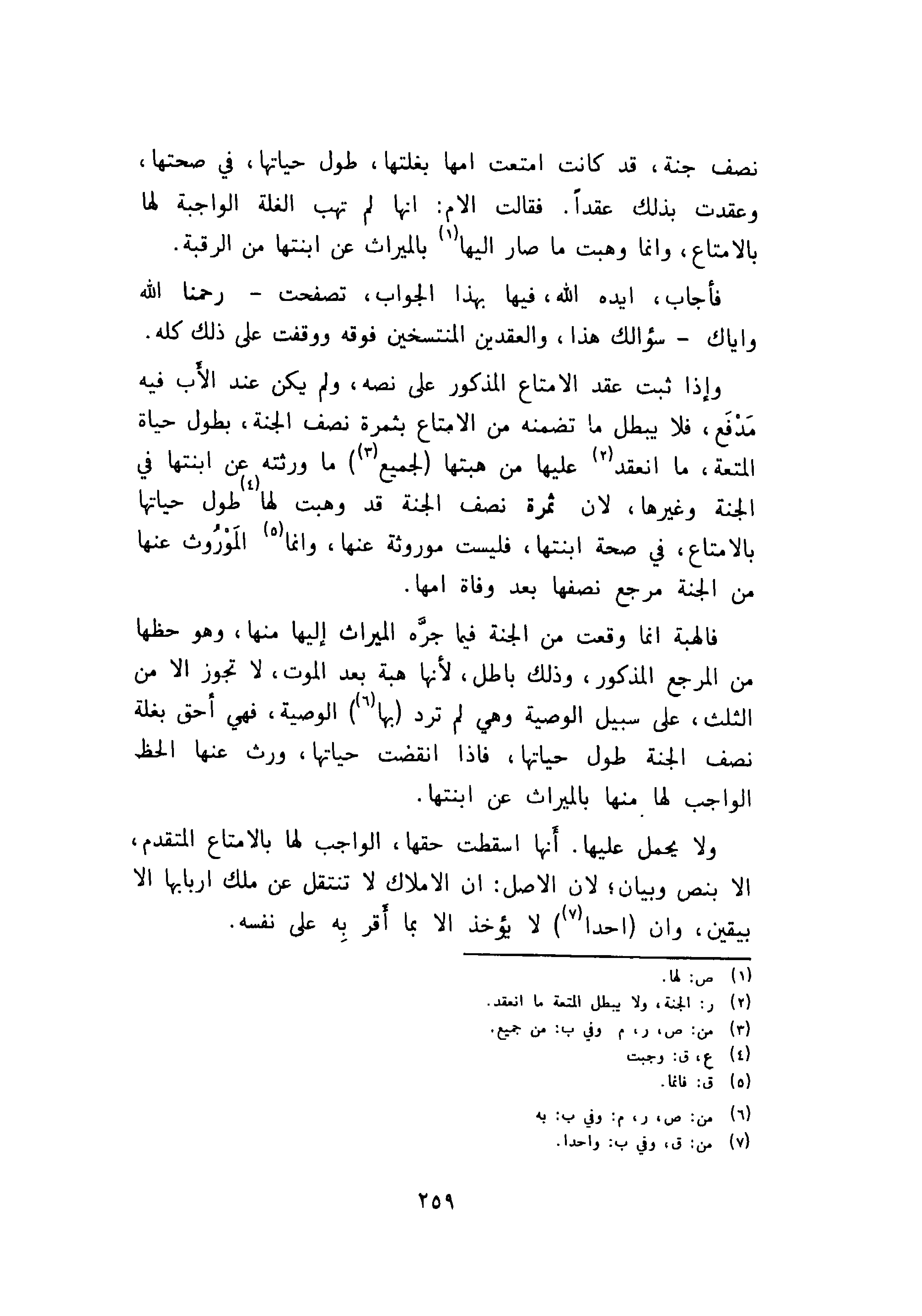وإذا ثبت عقد الامتاع المذكور على نصه، ولم يكن عند الأب فيه مدفع، فلا يبطل ما تضمنه من الامتاع بثمرة نصف الجنة، بطول حياة المتعة، ما انعقد عليها من هبتها لجميع ما ورثته عن ابنتها في الجنة وغيرها، لان ثمرة نصف الجنة قد وهبت لها طول حياتها بالامتاع، في صحة ابنتها، فليست موروثة عنها، وانما الموروث عنها من الجنة مرجع نصفها بعد وفاة امها.