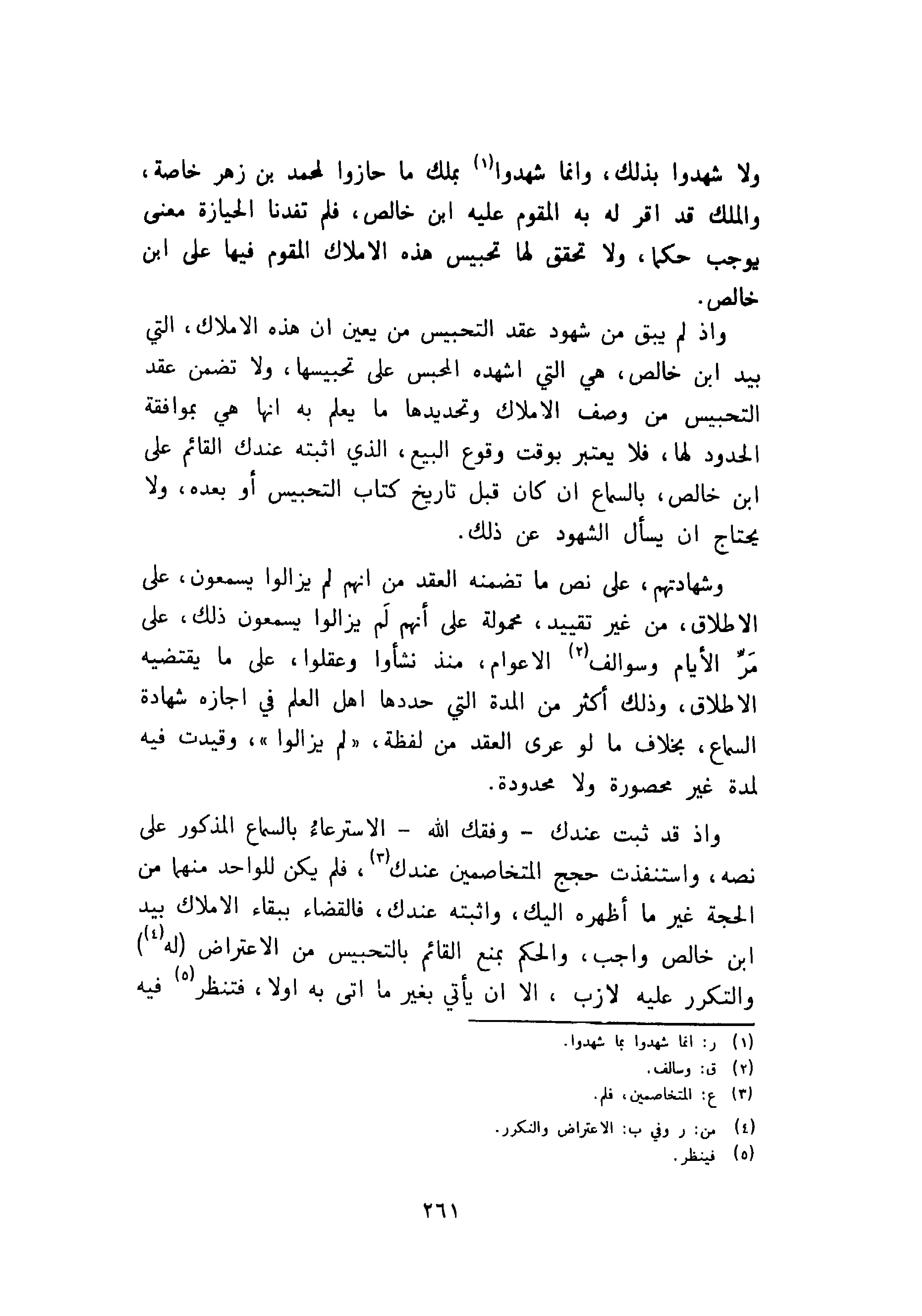واذ لم يبق من شهود عقد التحبيس من يعين ان هذه الاملاك، التي بيد ابن خالص، هي التي اشهده المحبس على تحبيسها، ولا تضمن عقد التحبيس من وصف الاملاك وتحديدها ما يعلم به انها هي بموافقة الحدود لها، فلا يعتبر بوقت وقوع البيع، الذي اثبته عندك القائم على ابن خالص، بالسماع ان كان قبل تاريخ كتاب التحبيس أو بعده، ولا يحتاج ان يسأل الشهود عن ذلك.