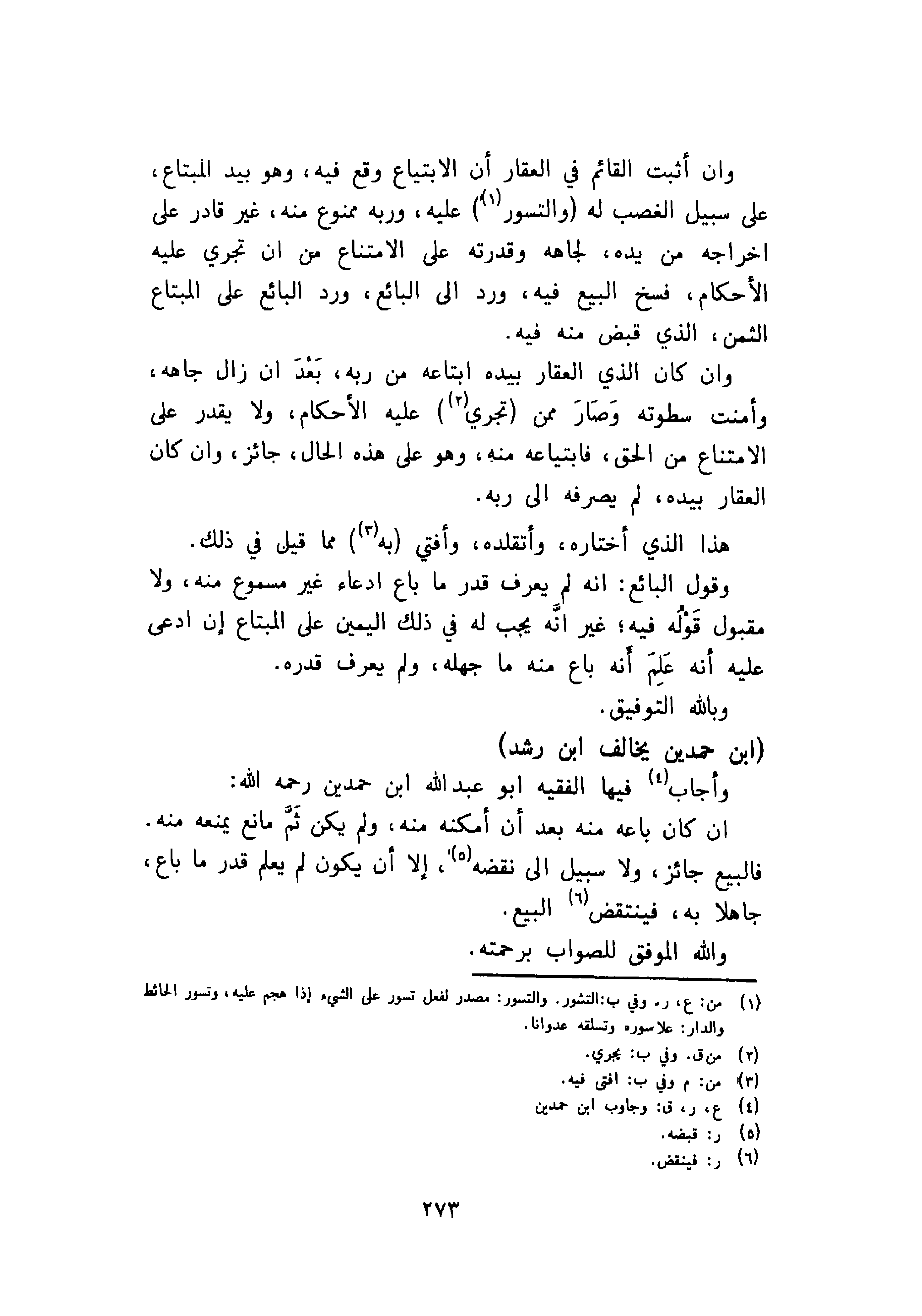 وان أثبت القائم في العقار أن الابتياع وقع فيه، وهو بيد المبتاع على سبيل الغصب له والتسور عليه، وربه ممنوع منه، غير قادر على اخراجه من يده، لجاهه وقدرته على الامتناع من ان تجري عليه الأحكام، فسخ البيع فيه ورد إلى البائع، ورد البائع على المبتاع الثمن، الذي قبض منه فيه.