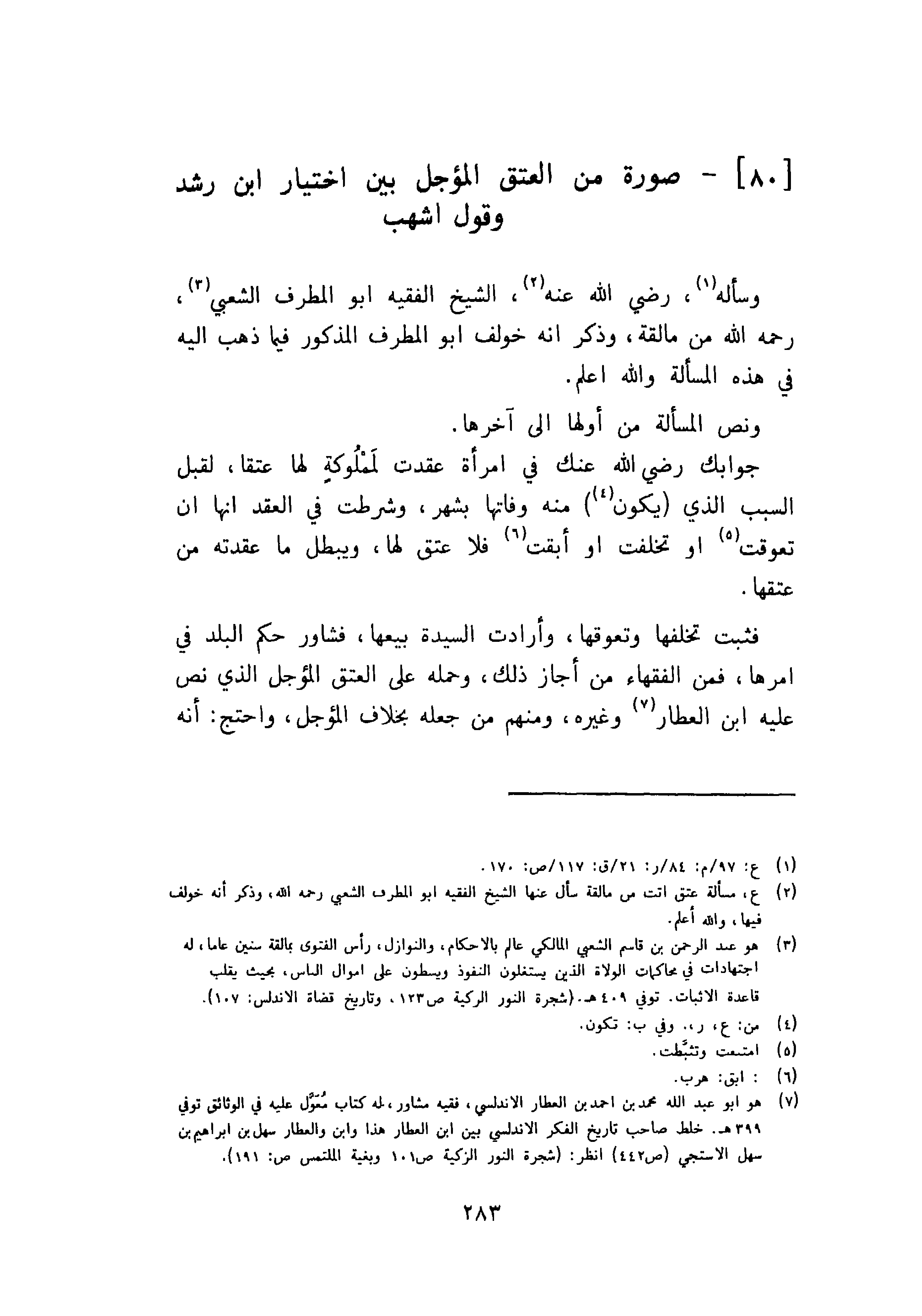 [80]- صورة من العتق المؤجل بين اختيار ابن رشد وقول أشهب