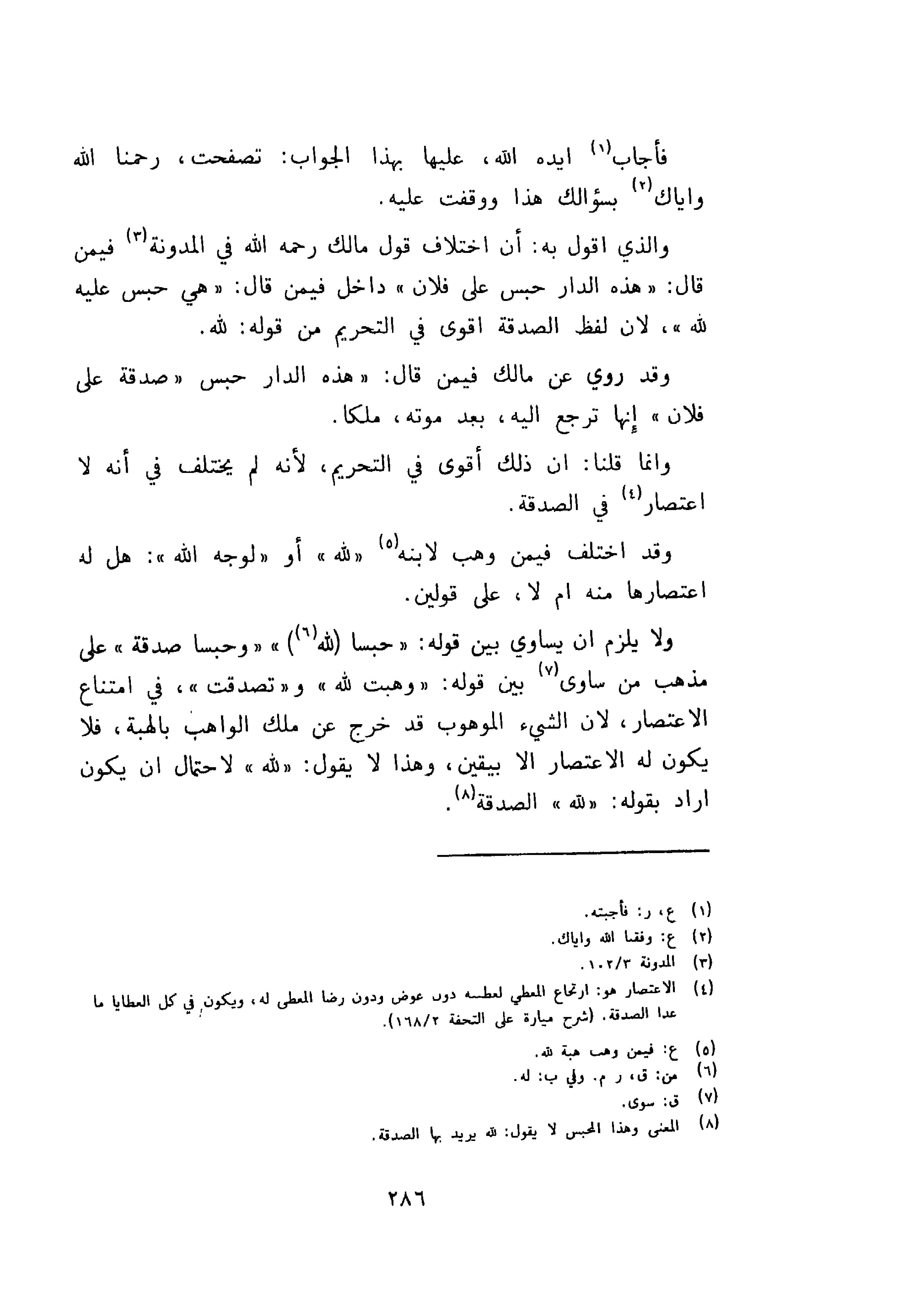 ولا يلزم ان يساوي بين قوله: حسبا لله وحبسا صدقة على مذهب من ساوى بين قوله وهبت لله وتصدقت في امتناع الاعتصار لان الشيء الموهوب قد خرج عن ملك الواهب بالهبة فلا يكون له الاعتصار الا بيقين، وهذا لا يقول لله لاحتمال ان يكون اراد بقوله: لله الصدقة.