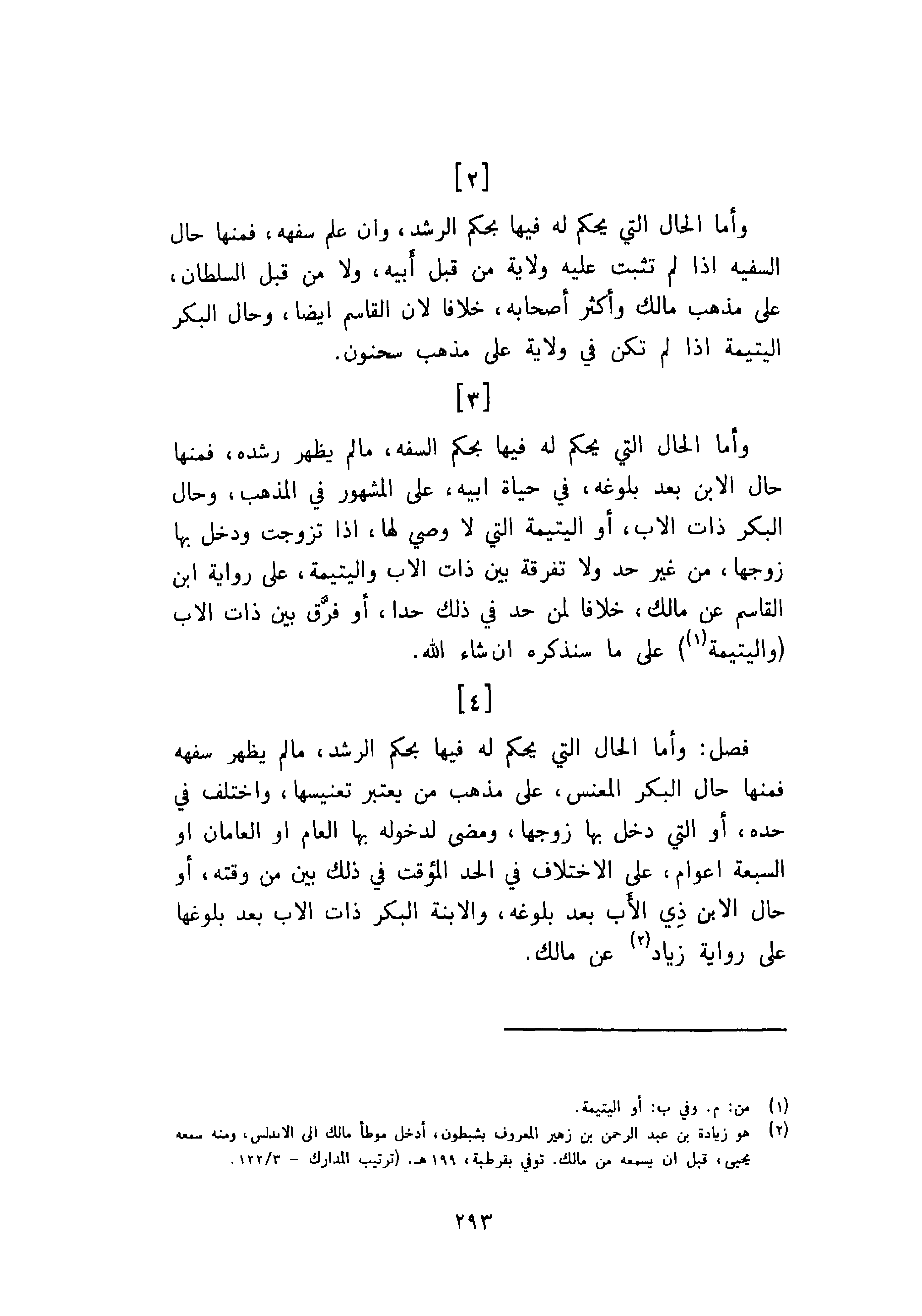 وأما الحال التي يحكم فيها بحكم السفه، ما لم يظهر رشده، فمنها حال الابن بعد بلوغه، في حياة ابيه، على المشهور في المذهب، وحال البكر ذات الاب، أو اليتيمة التي لا وصي لها إذا تزوجت ودخل بها زوجها من غير حد ولا تفرقة بين ذات الاب واليتيمة، على رواية ابن القاسم عن مالك، خلافا لمن حد في ذلك حدا، أو فرق بين ذات الاب واليتيمة على ما سنذكره ان شاء الله.