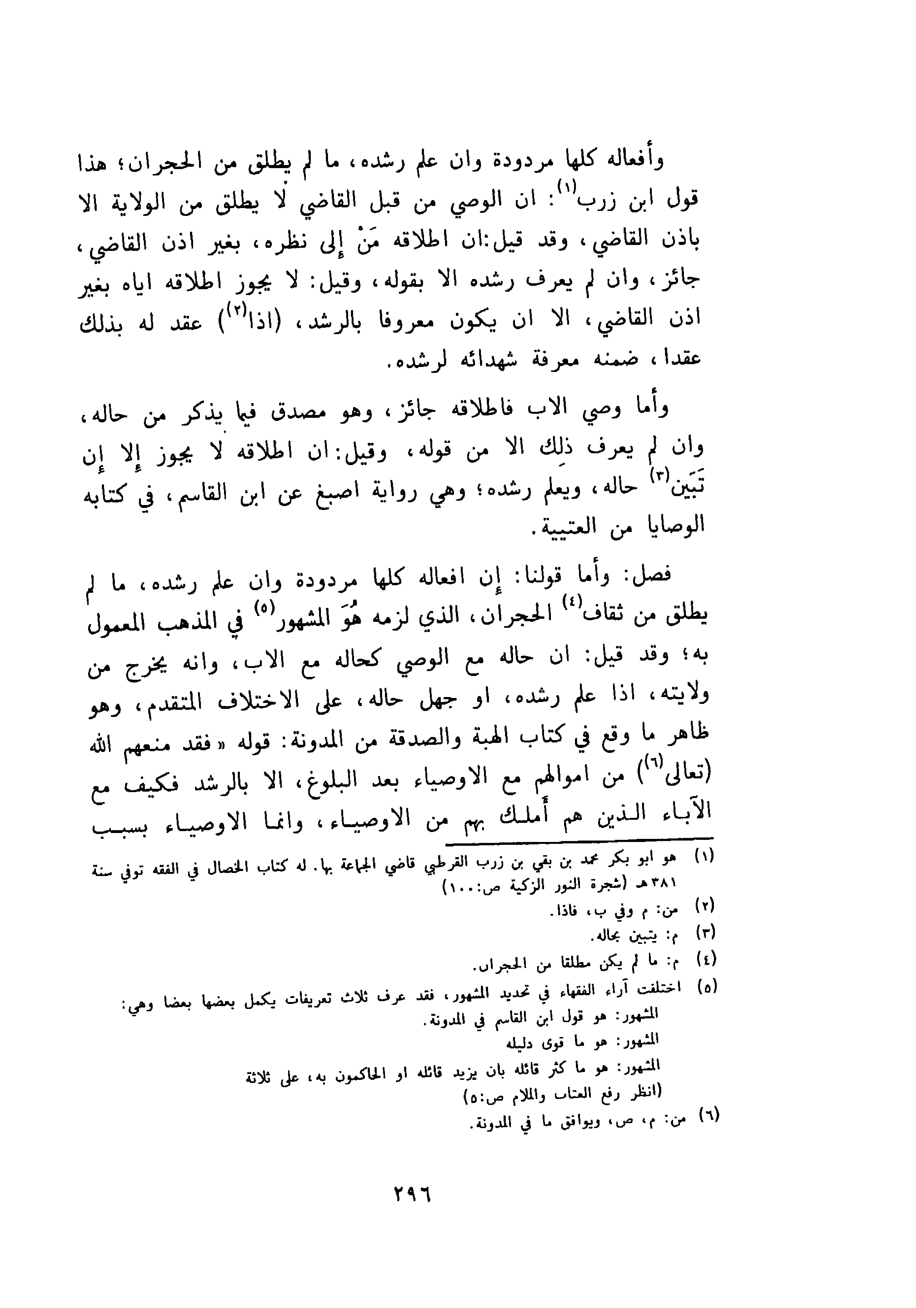 وأفعاله كلها مردودة وان علم رشده ما لم يطلق من الحجران هذا قول ابن زرب: ان الوصي من قبل القاضي لا يطلق من الولاية الا باذن القاضي وقد قيل: ان اطلاقه من إلى نظره، بغير اذن القاضي جائز وان لم يعرف رشده الا بقوله، وقيل لا يجوز اطلاقه اياه بغير اذن القاضي الا ان يكون معروفا بالرشد إذا عقد له بذلك عقدا ضمنه معرفة شهدائه لرشده.