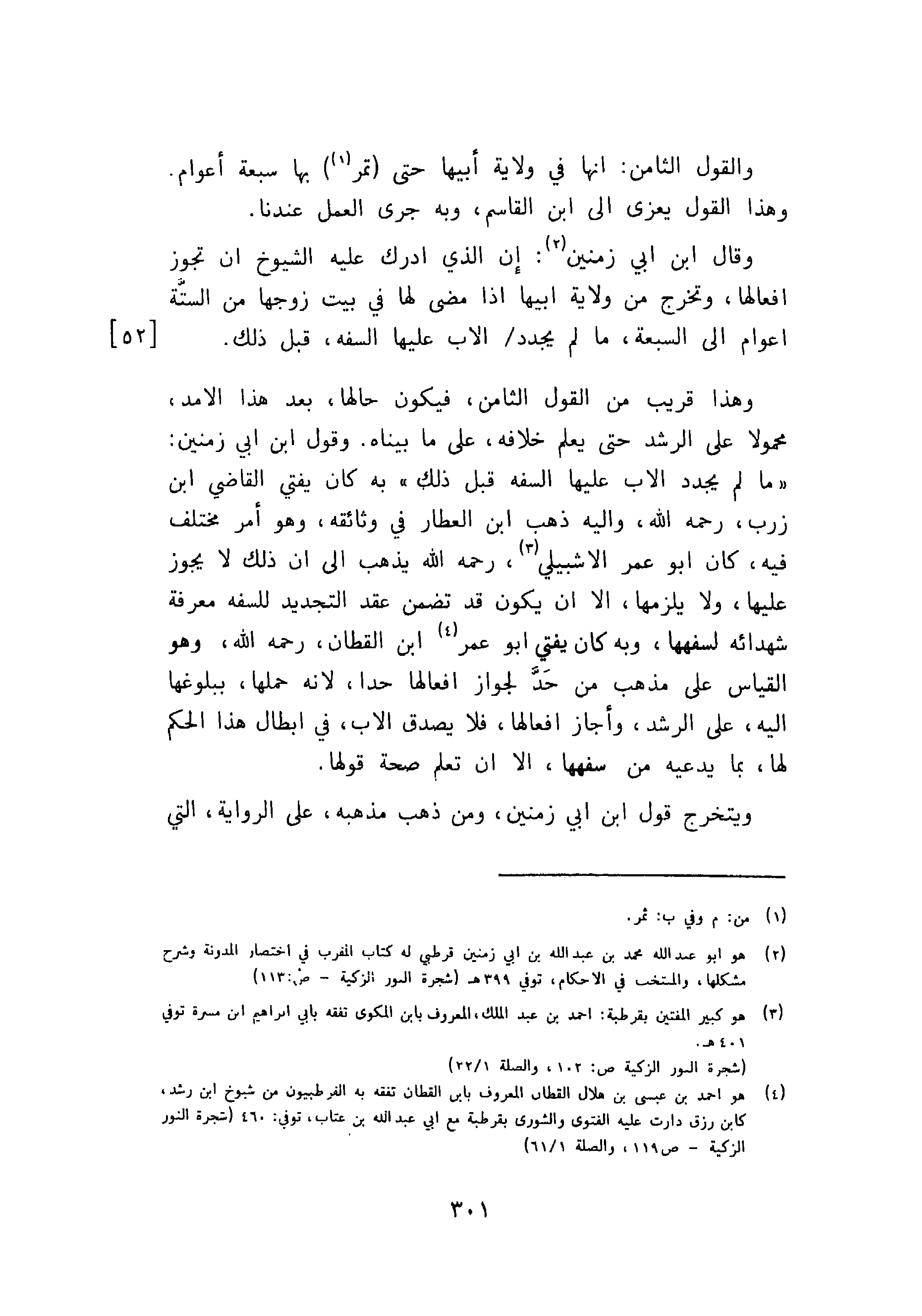 [52] وهذا قريب من القول الثامن، فيكون حالها، بعد هذا الامد، محمولا على الرشد حتى يعلم خلافه، على ما بيناه. وقول ابن ابى زمنين: «ما لم يجددالاب عليها السفة قبل ذلك» به كان يفتى القاضى ابن زرب، رحمه الله، واليه ذهب ابن العطار في وثائقه، وهو أمر مختلف فيه، كان ابو عمر اتلاشبيلى نصف رحمه الله يذهب إلى ان ذلك لا يجوز عليها، ولا يلزمها، الا ان يكون قد تضمن عقد التجديد للسفه معرفه شهدائه لسفهها، وبه كان يفتى ابو عمر ابن القطان، رحمه الله، وهو القياس على مذهب من حد لجوازافعالها حدا، لانه حملها، ببلوغها اليه، على الرشد، وأجاز افعالها، فلا يصدق الاب، في ابطال هذا الحكم لها، بما يدعيه من سفهها، الا ان تعلم صحة قولها.