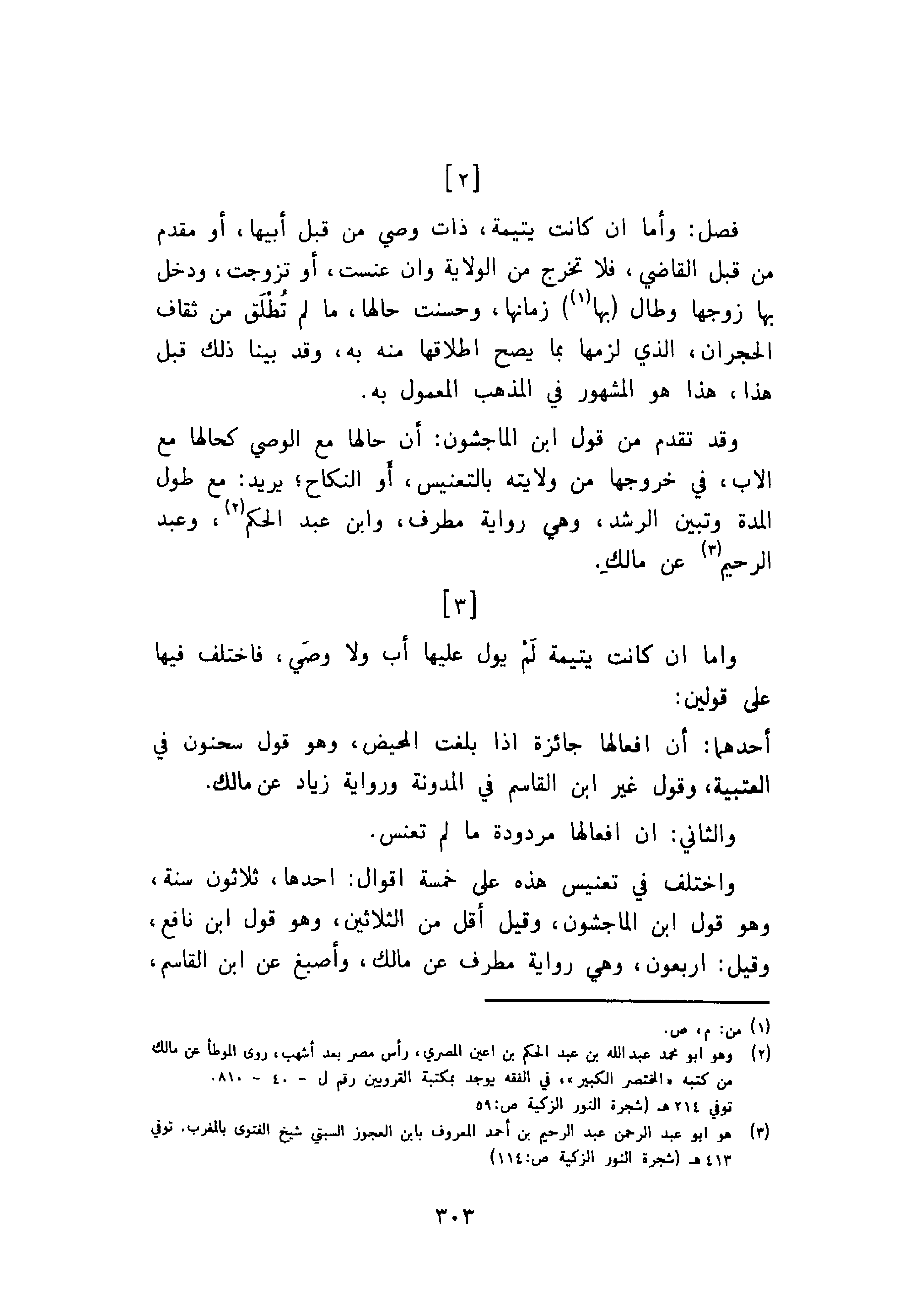 وقد تقدم من قول ابن الماجشون: أن حالها مع الوصى كحالها مع الاب، في خروجها من ولايته بالتعنيس، أو النكاح؛ يريد مع طول المدة وتبين الرشد، وهى رواية مطرف، وابن عبد الحكم، وعبد الرحيم عن مالك.