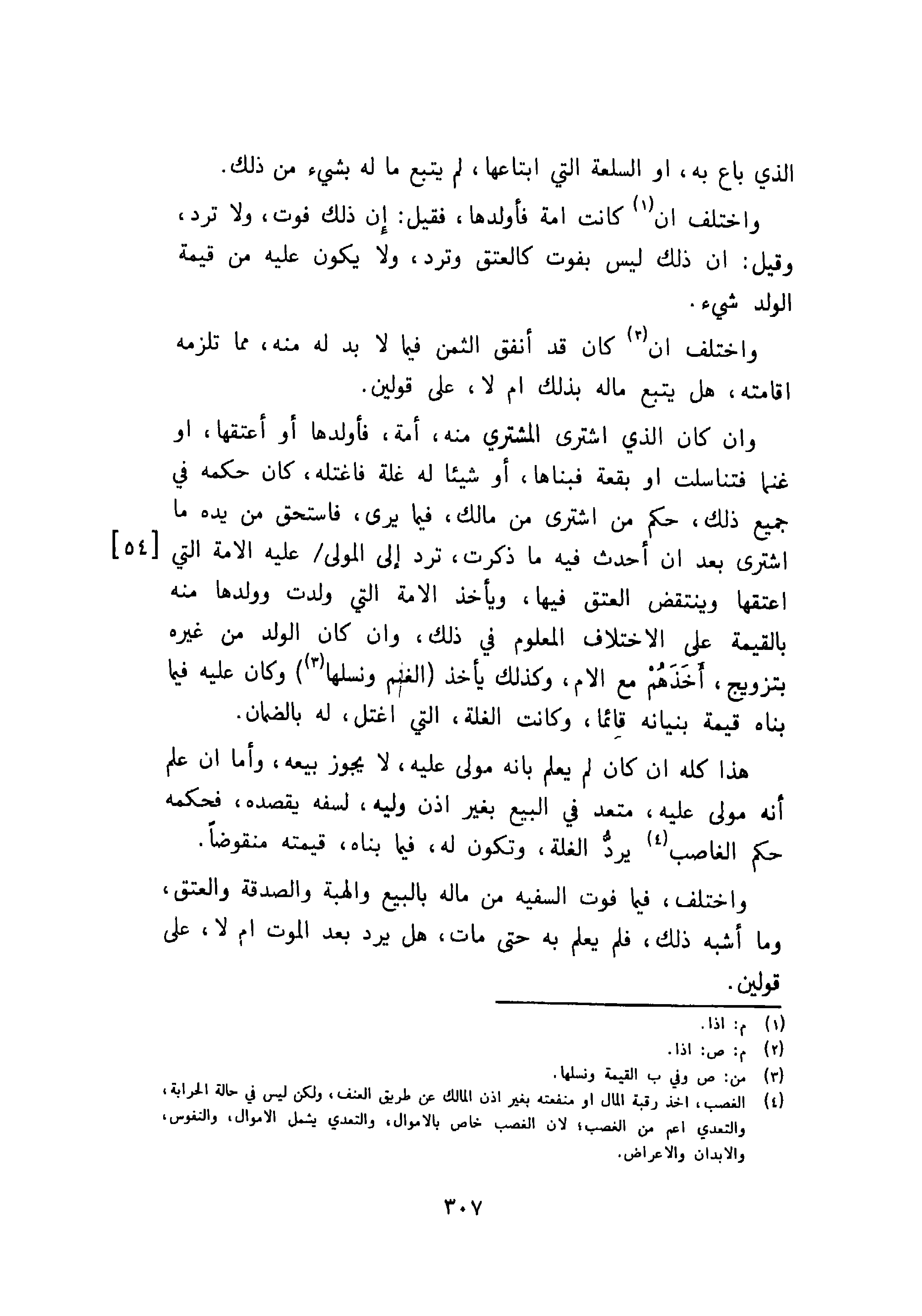 وان كان الذى اشترى المشترى منه، أمه، فأولدها أو أعتقها، او غنما فتناسلت او بقعة فبناها، أو شيئاً له غلة فاغتله، كان حكمه في جميع ذلك، حكم من اشترى من مالك، فيما يرى، فاستحق من يده ما اشترى بعد ان أحدث فيه ما ذكرت، ترد إلى المولى / عليه الامة التى [54] اعتقها وينقض العتق فيها، ويأخذ الامة التنى ولدت وولدها منه بالقيمة على الاختلاف المعلوم في ذلك، وان كان الولد من غيره بتزويج، أخذهم مع الام، وكذلك يأخذ الغنم ونسلها وكان عليه فيما بناه قيمة بنيانه قائما، وكانت الغلة، التى اغتل، له بالضمان.