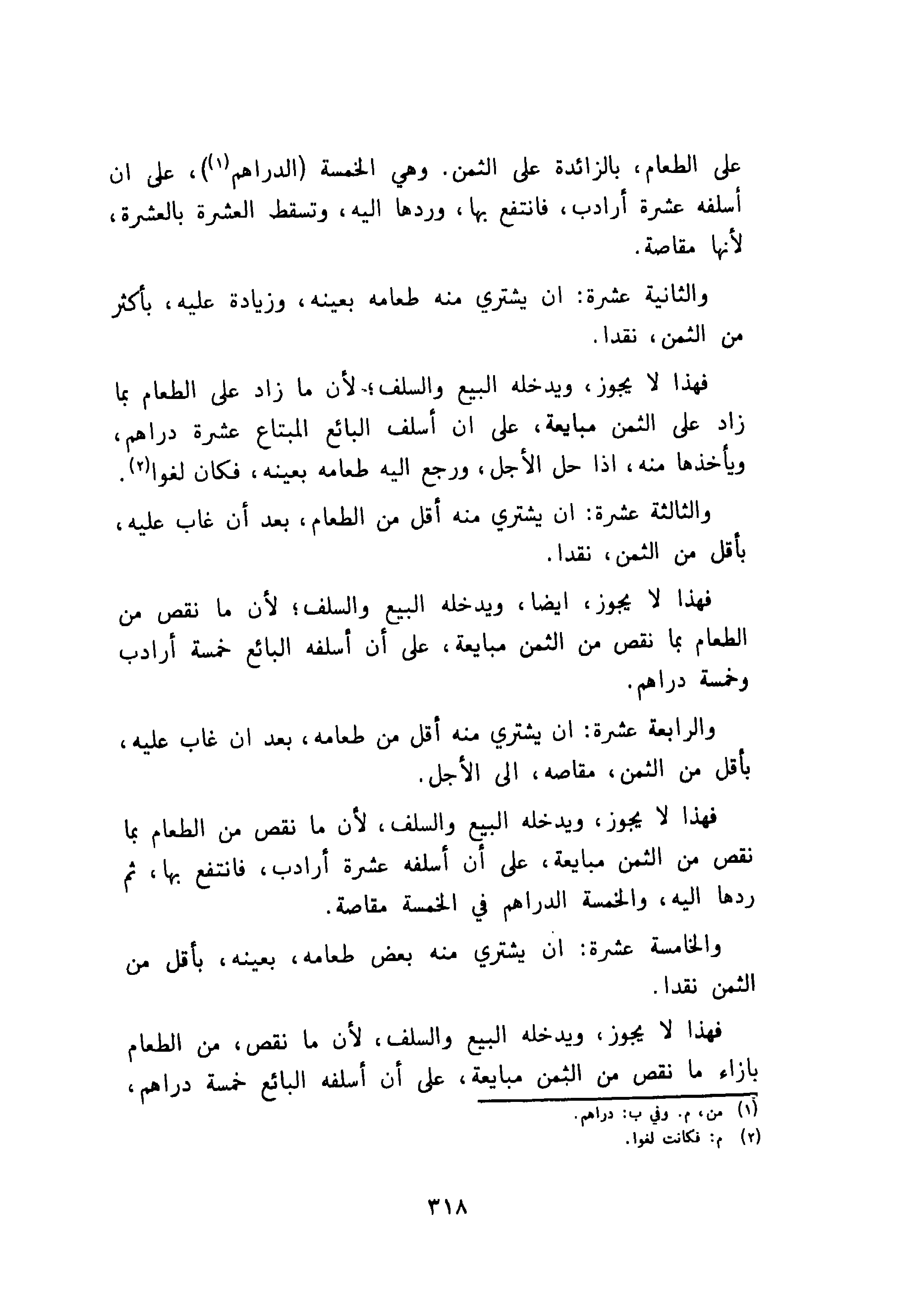 فهذا لا يجوز، ويدخله البيع والسلف، لأن ما نقص، من الطعام بازاء ما نقص من الثمن مبايعة، على أن أسلفه البائع خمسة دراهم،