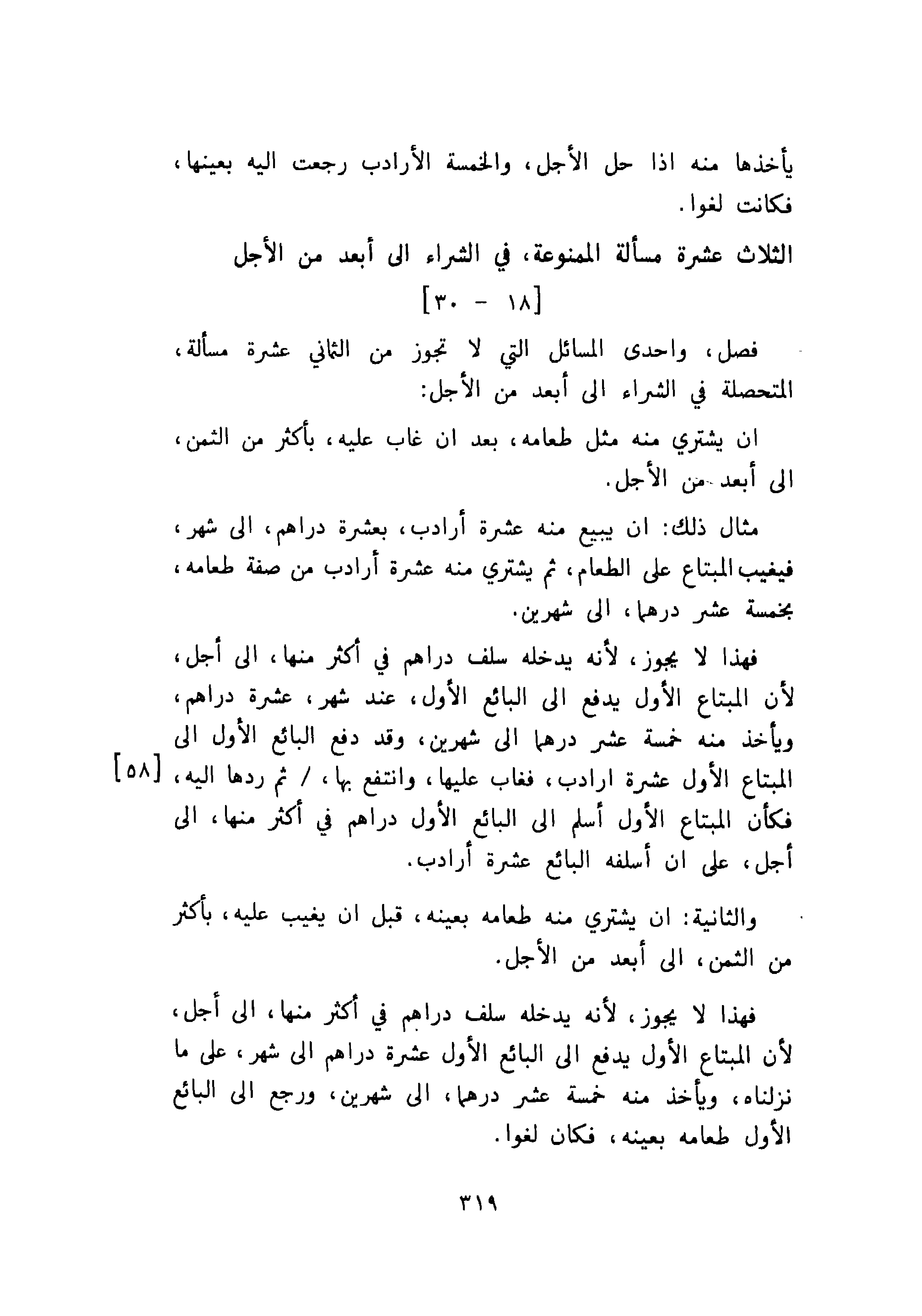 فصل، واحدى المسائل التي لا تجوز من الثماني عشرة مسألة، المتحصلة في الشراء إلى أبعد من الأجل: