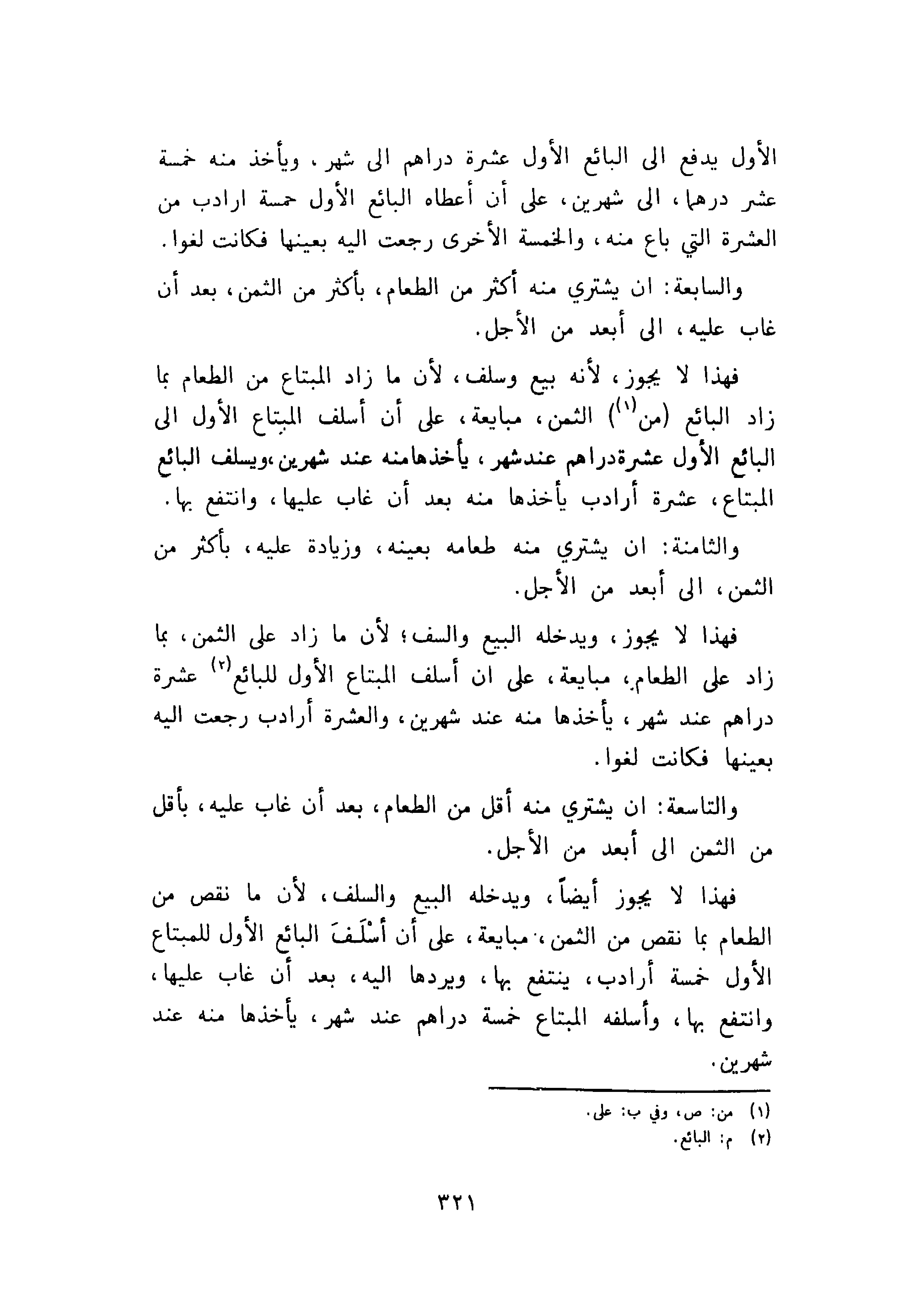 الأول يدفع إلى البائع الأول عشرة دراهم إلى شهر، ويأخذ منه خمسة عشر درهما، إلى شهرين، على أن أعطاه البائع الأول خمسة ارادب من العشرة التي باع منه، والخمسة الأخرى رجعت اليه بعينها فكانت لغوا.