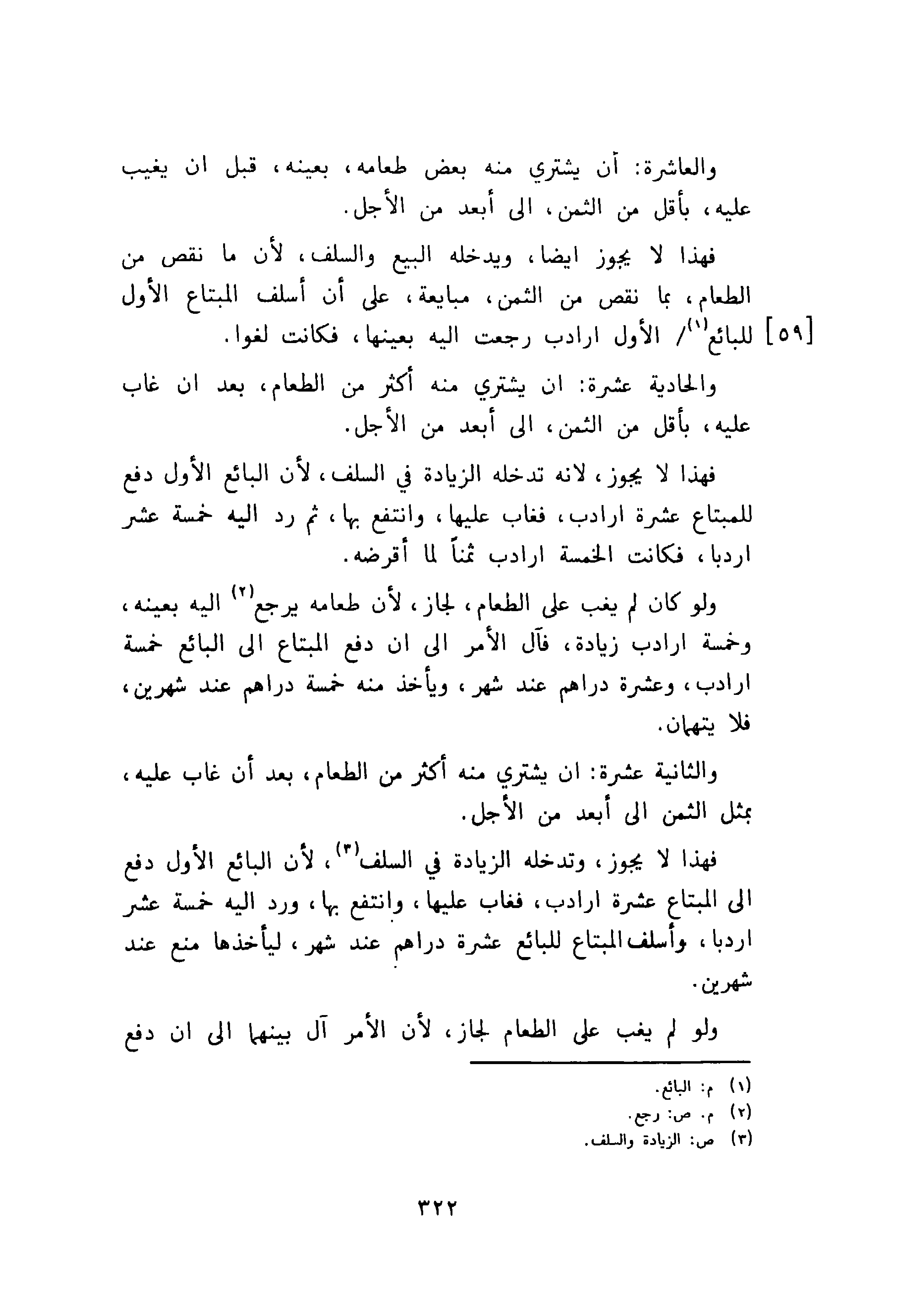 والعاشرة: أن يشترى منه طعامه، بعينه، قبل ان يغيب عليه، بأقل من الثمن، إلى أبعد نت الأجل.